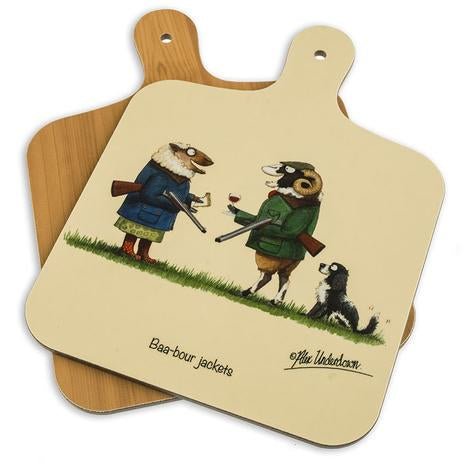British-made mini chopping boards which are also great for serving cheeses and charcuterie. 17.5cm wide by 23.5cm tall, tough melamine and wood laminated construction. Fun cartoon image by Alex Underdown.