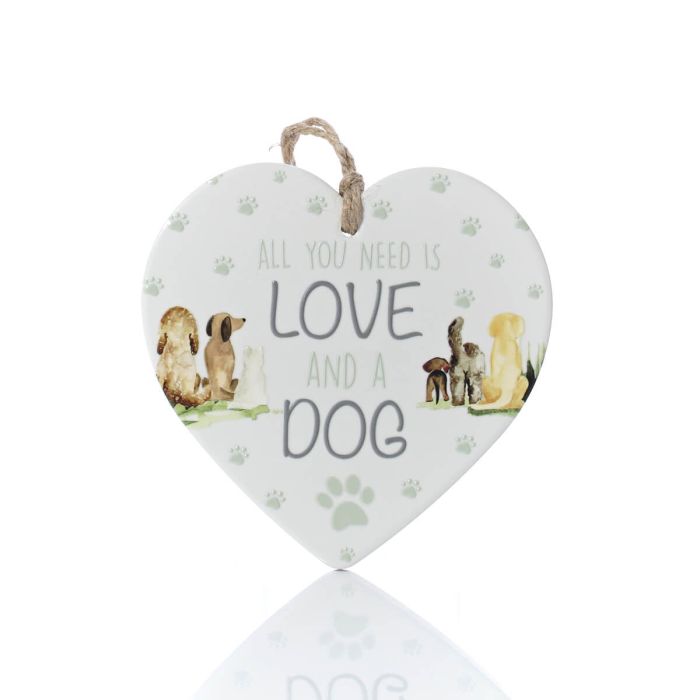 Heart-shaped ceramic hanging ornament with a raised pattern, white base colour, features printed dogs, green paw prints, and the text "ALL YOU NEED IS LOVE AND A DOG." Jute string attached for hanging.