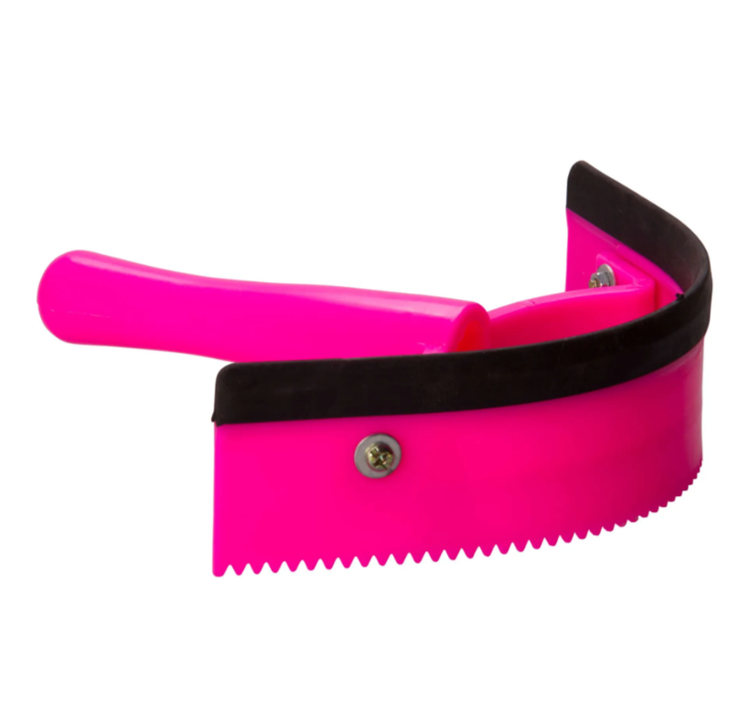 Ergonomic half round sweatscraper. This product is not only stylish it is also specially made to make sure that the handle lies comfortably in your hand. The special gripped handle also helps your blood circulation to flow whilst grooming.