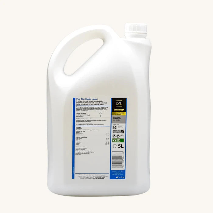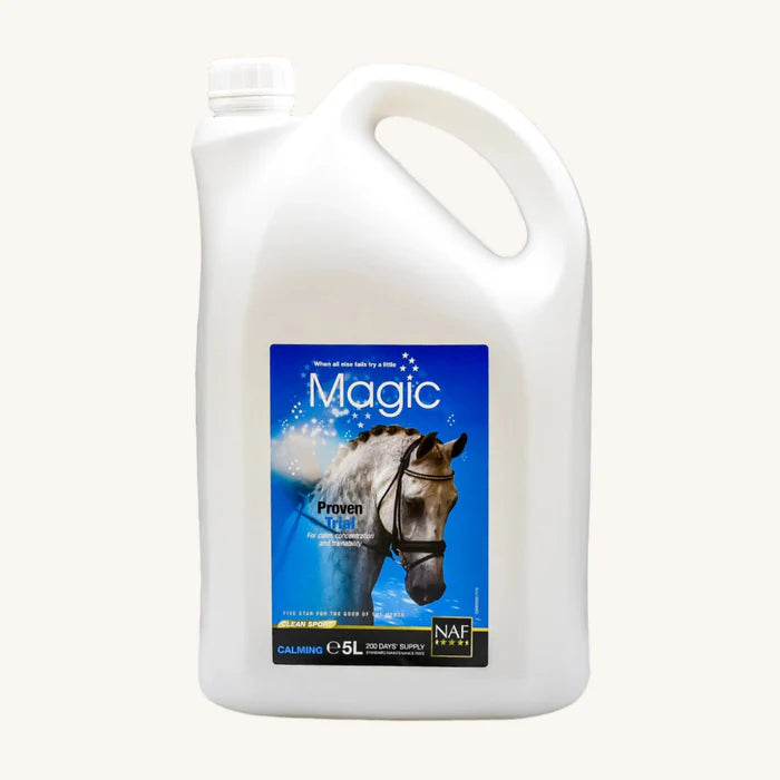 NAF Five Star Magic Liquid besteht aus Magnesium, der gleichen einzigartigen Kräuterkombination, die auch in Magic Powder verwendet wird. Es hat den Vorteil, dass die Wirkstoffe aus den Kräutern extrahiert werden und diese somit leichter für die Aufnahme durch das Pferd verfügbar sind. Die beruhigende Wirkung ist schnell sichtbar. Magnesium ist ein essentieller Nährstoff für das Wohlbefinden des Pferdes und spielt unter anderem bei der Regulierung nervöser Spannungen eine Rolle. Da Magnesium auch auf die Muskelspannung einwirkt, kann ein Pferd mit niedrigem Magnesiumgehalt angespannt wirken und Angst, Erregbarkeit und mangelndes Selbstvertrauen zum Ausdruck bringen. Ein Mangel an Magnesium kann durch einen Weidemangel oder einfach durch den individuellen Stoffwechsel eines Pferdes oder Ponys verursacht werden. Auch durch regelmäßige Reisen und Wettkämpfe kann der Magnesiumspiegel gesenkt werden. Magie ist mehr als nur Magnesium; Es enthält außerdem eine Kräutermischung, die aufgrund ihrer traditionellen Verwendung zur Unterstützung von Selbstvertrauen und Konzentration ausgewählt wurde. Die einzigartige Mischung aus Magnesium und pflanzlicher Unterstützung von Magic ermöglicht es dem Pferd, alles, was von ihm verlangt wird, ruhig und selbstbewusst anzugehen.