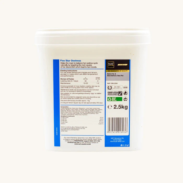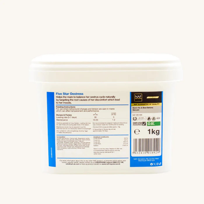Oestress Powder ergänzt den natürlichen Brunstzyklus der Stute, indem es die Regelmäßigkeit fördert und Extrakte aus pflanzlichen Inhaltsstoffen bereitstellt, die seit Hunderten von Jahren zur Unterstützung des Hormonhaushalts verwendet werden. Indem Sie also ihre Ernährung mit Oestress verbessern, helfen Sie Ihrer Stute, sich selbst zu helfen. Oestress liefert außerdem bioverfügbares Magnesium, um Muskelverspannungen zu lösen und die Ruhe zu fördern. Schließlich ist Oestress reich an natürlichen Antioxidantien, um ein gesundes System auf natürliche Weise zu unterstützen. Oestress sollte während der Frühlings- und Sommersaison täglich gefüttert werden und kann je nach Brunstzyklus erhöht werden. Bei Bedarf ist Oestress jedoch für den ganzjährigen Einsatz geeignet.