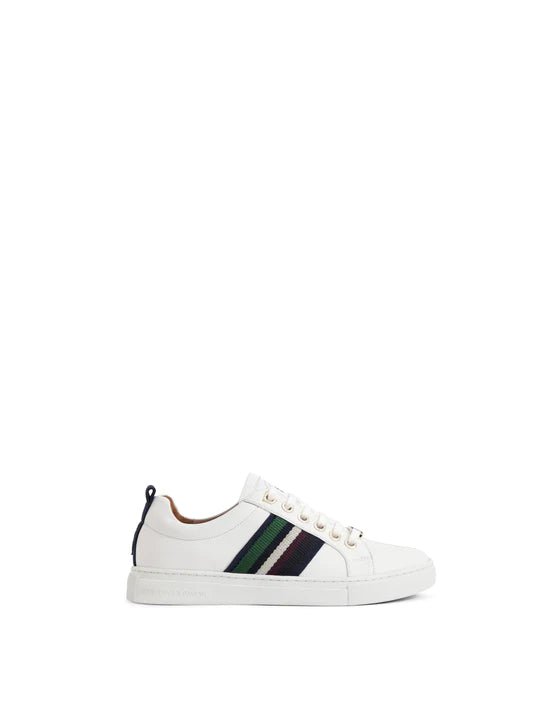 Fairfax & Favor Boston Trainers bring a pop of colour to summer days with plum, cream and forest green striped webbing — a Wimbledon-inspired touch that calls to sunny weekends spent outdoors.