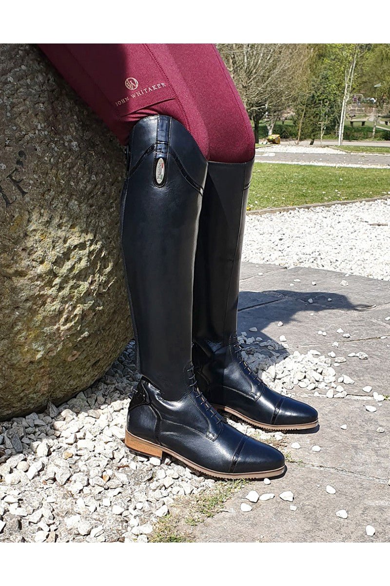 Exquisitely detailed and beautifully crafted, the Florence Boot from Brogini is the epitome of style. This luxurious leather boot features striking patent croc-embossed detailing and the wood effect sole harks back to the traditional English riding boot. The Florence are soft grained leather tall riding boots with stitched toecap, rear zip and elongated top knee line. This classic riding silhouette is contrast with modern details such as the patent croc-effect around the topline and delicately placed sections around the toe.