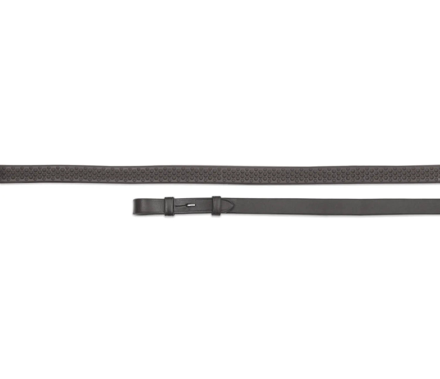 These reins feature rubber pimple grips with a softer, but no less effective grip. Hook stud billets and stainless steel fittings. Restrained design gives Velociti GARA leatherwork enduring appeal.