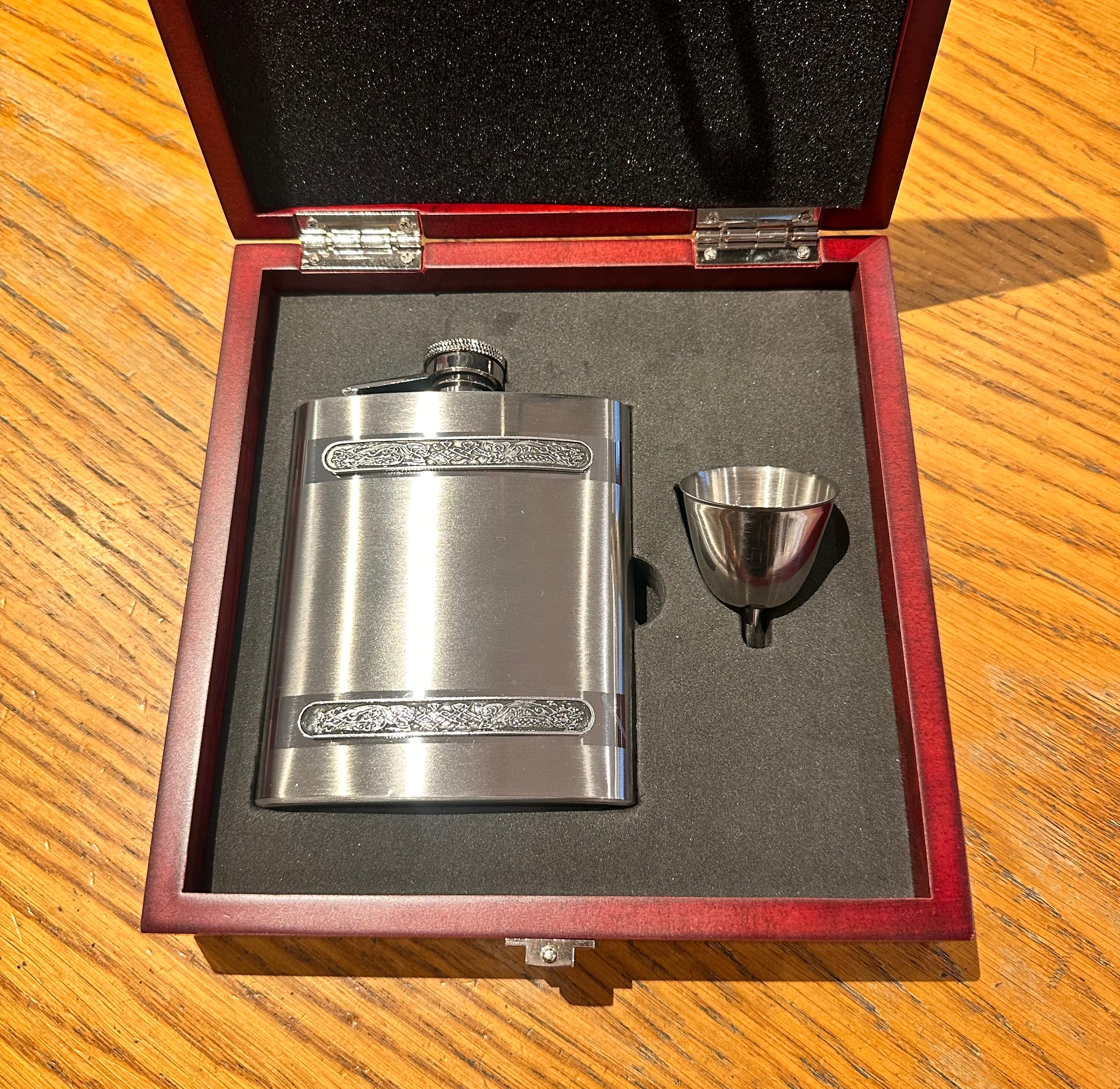 This attractive gift set contains a beautiful stainless steel 8oz Hip Flask featuring refined Celtic designs and a small funnel, presented in an elegant redwood gift box. Perfect for the avid shooter or country life enthusiast.