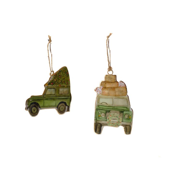 Metal hangers shaped like the iconic Landy Defender, one with a Christmas tree, one with stacked presents, each with a jute string loop.