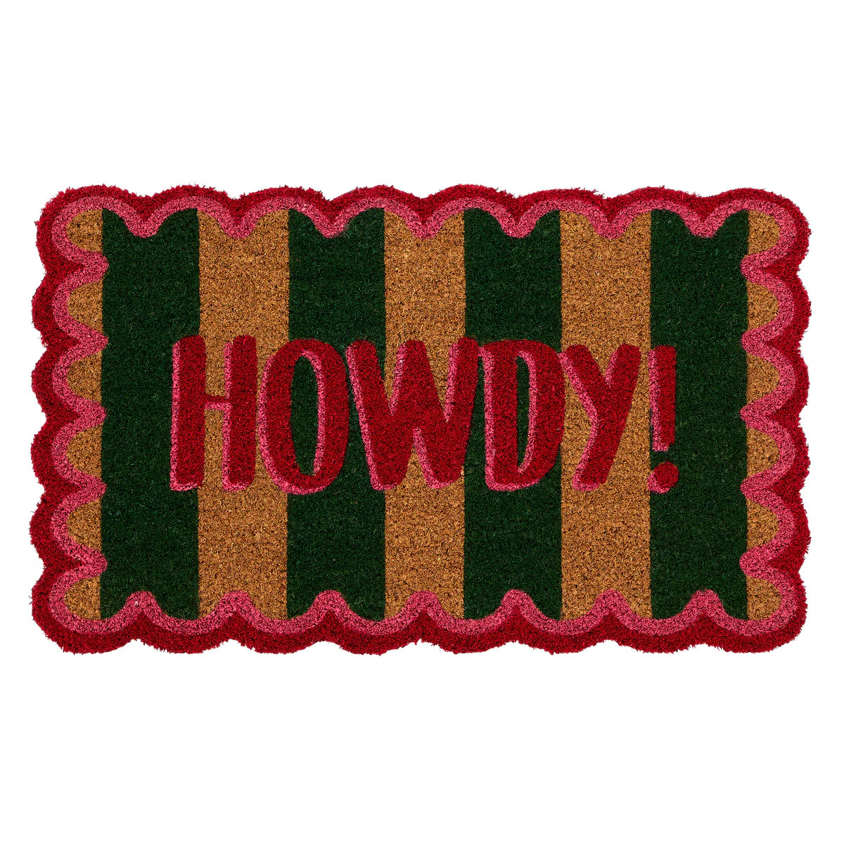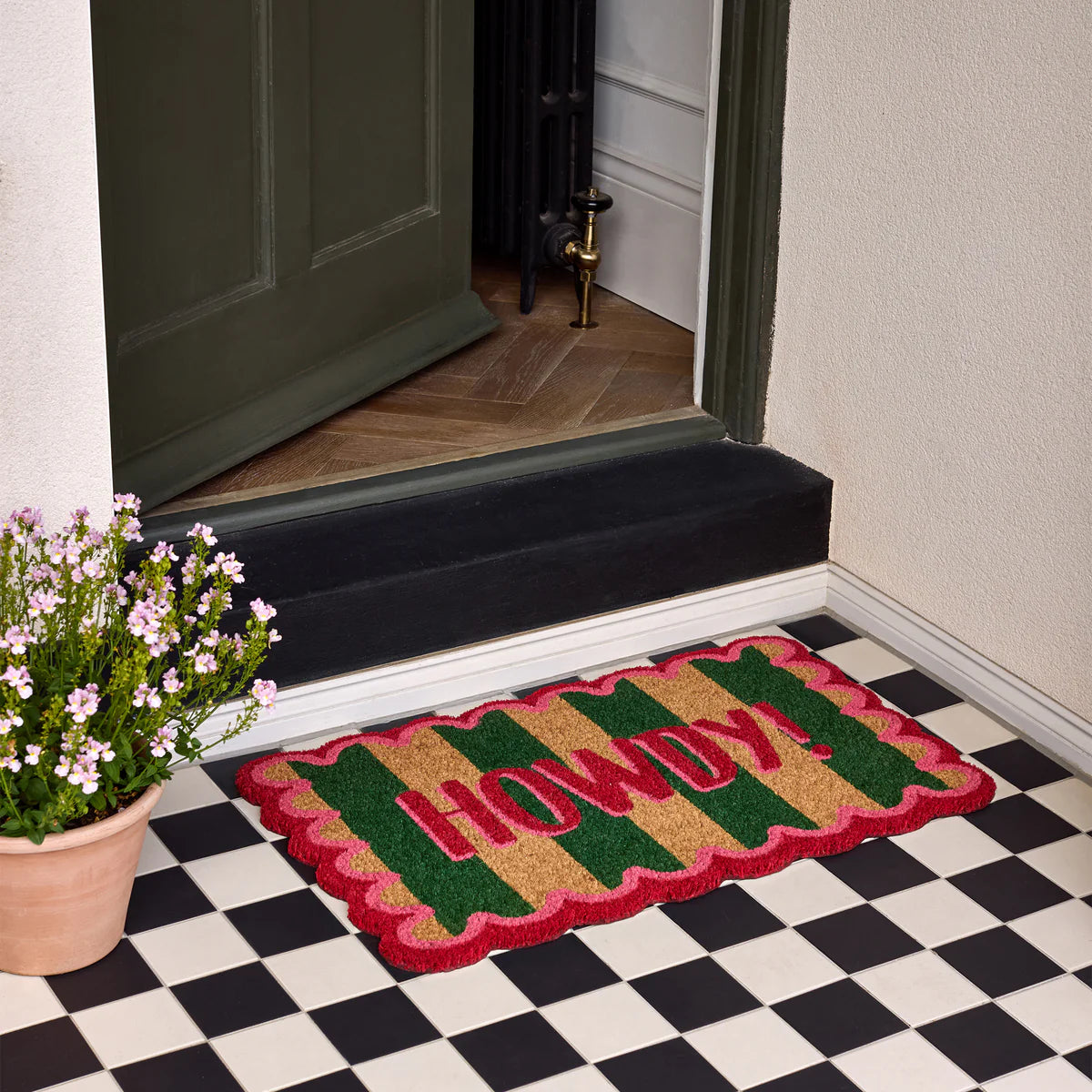 Add some colour to your home with our Howdy Stripe coir doormat, featuring a natural and green striped background with a pink wavy border, and the word 'Howdy!' in the centre of the design.
