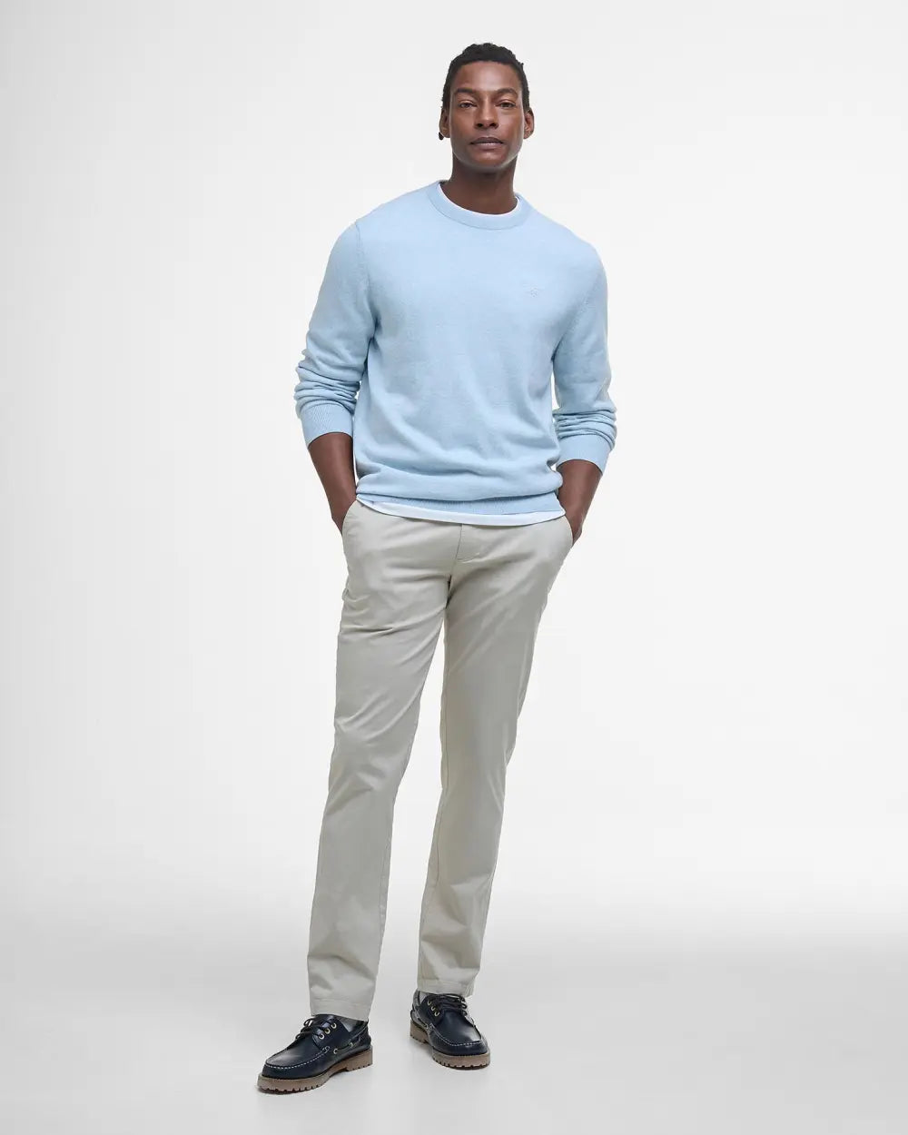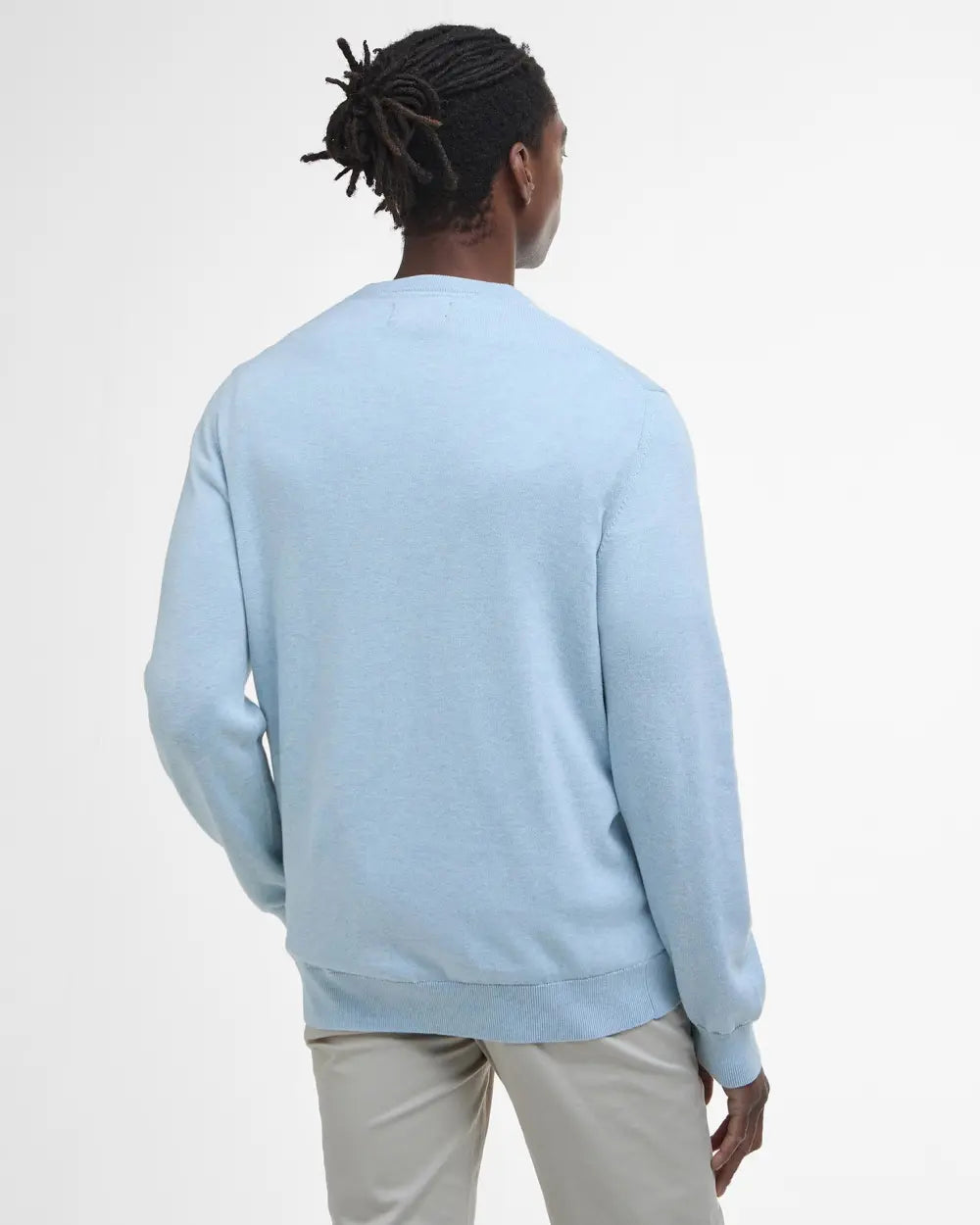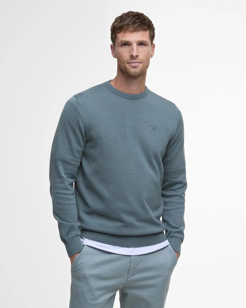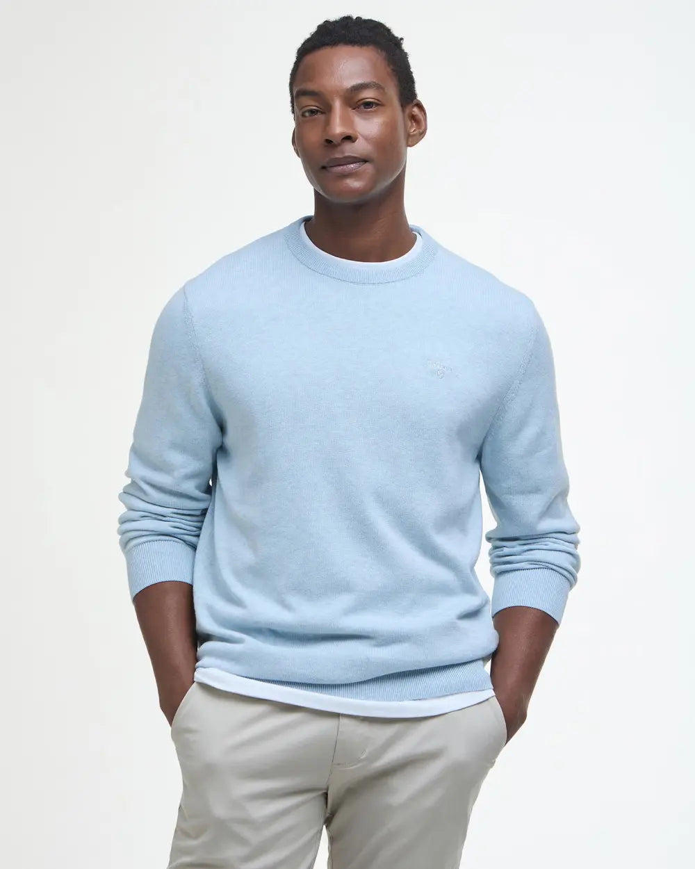 Model height: 6'2.5", wearing size M. Experience the luxurious comfort and timeless style of the Barbour Men's Pima Cotton Crew Neck today. Don’t miss out—add this essential piece to your collection and redefine your casual look!