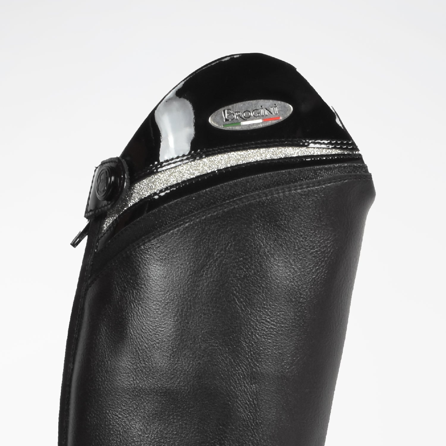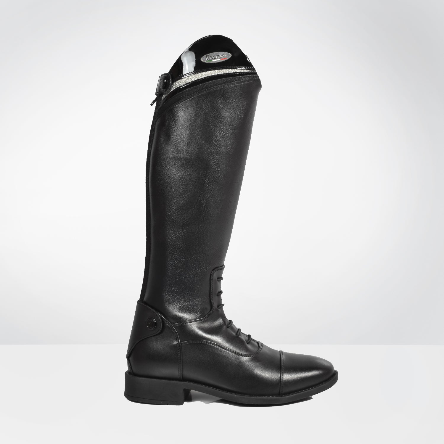 The Como Piccino Patent and Sparkle Stripe blends everyday comfort with a little bit of sparkle - featuring a genuine leather foot, stretch synthetic calf, grip panel, and full rear zip for young riders who want performance and polish.