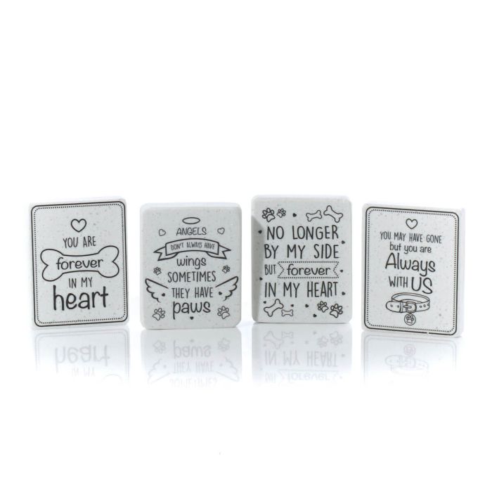 Resin pet memorial standing blocks with sentimental quotes. A heartfelt piece to remember your four-legged friends by.