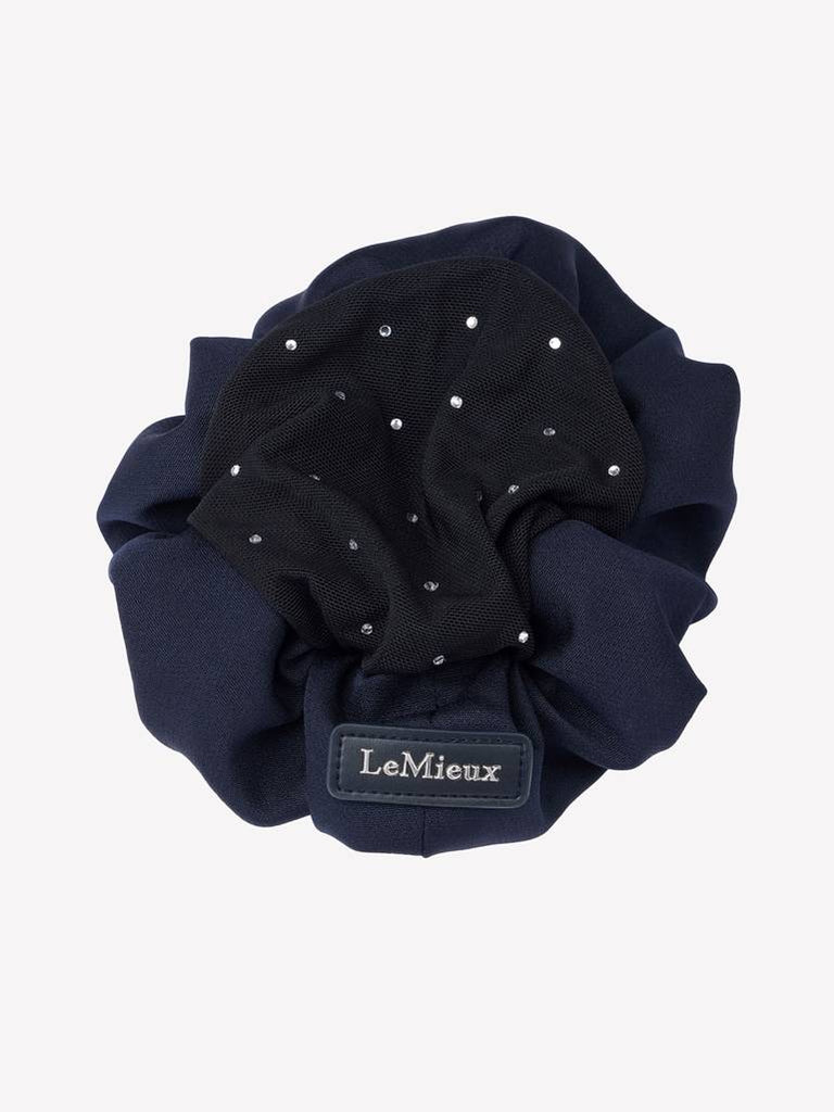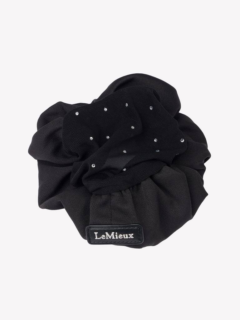 Elegant satin hair scrunchie with a LeMieux logo badge. A sewn-in hairnet adorned with sparkling crystals keeps your hair tidy while you ride, ideal for shows and events. Two hidden claw clips firmly attach to your hair.