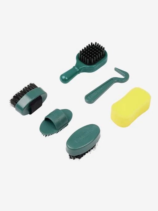 The set includes brushes, a curry comb, a sponge, a tangle tidy and a hoof pick, all in a neat zipped grooming bag to take wherever you go.