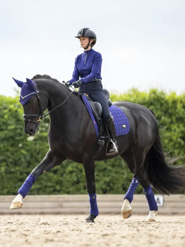 The textured PU leather girth protection area is complemented by an embossed logo and carries the usual signature LeMieux lower girth strap with its inner locking loops. The piece de resistance of the Loire Dressage Square is its unique metal badge on a leather mount in the lower back corner.