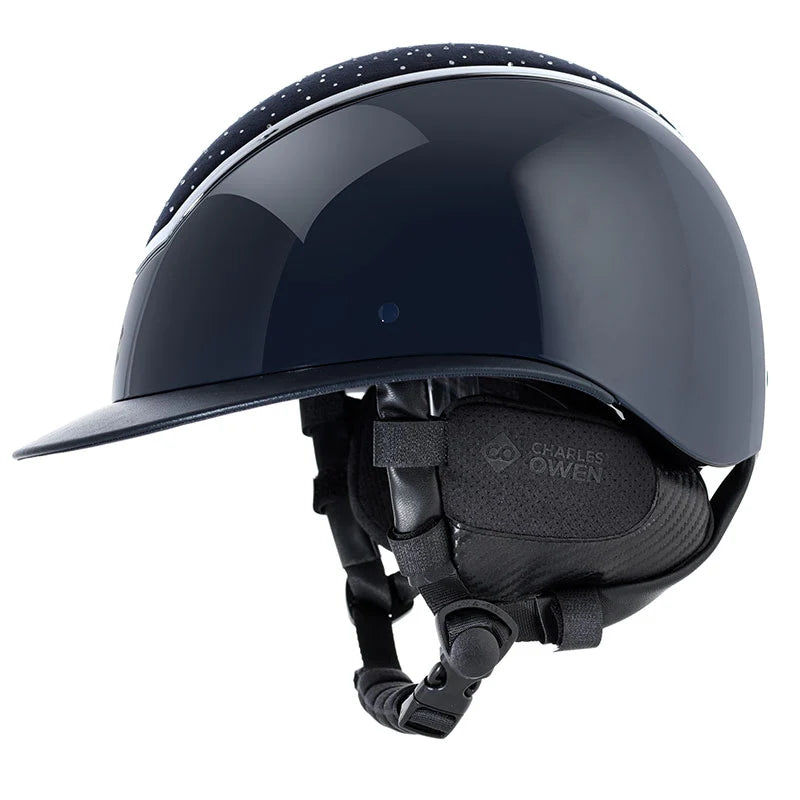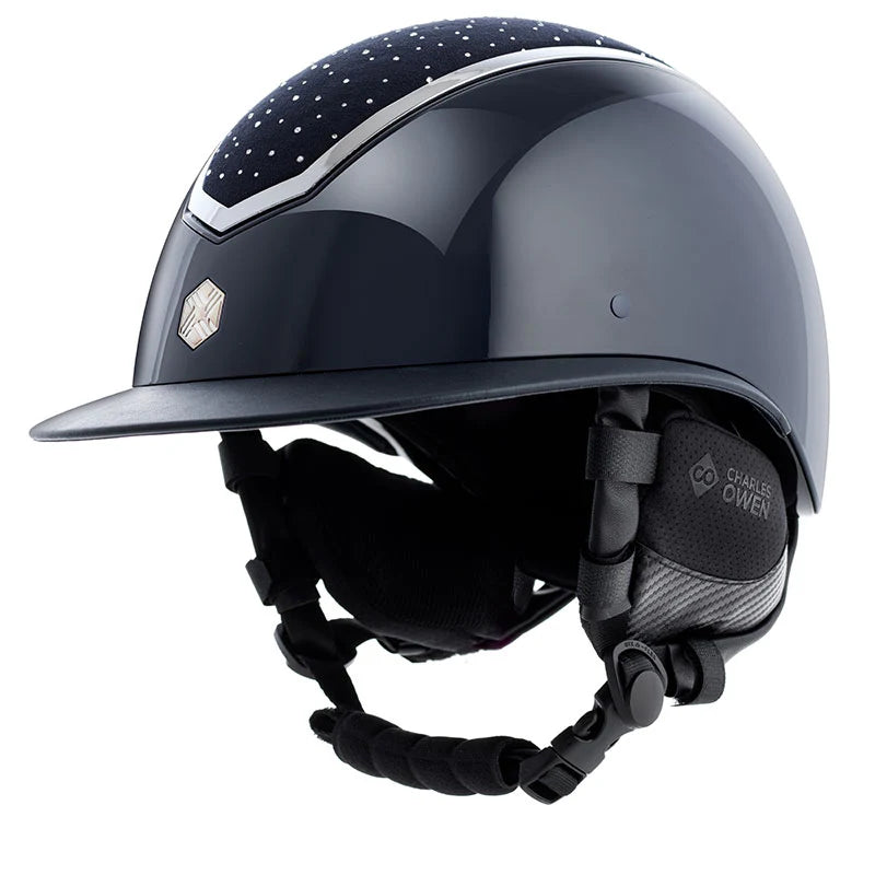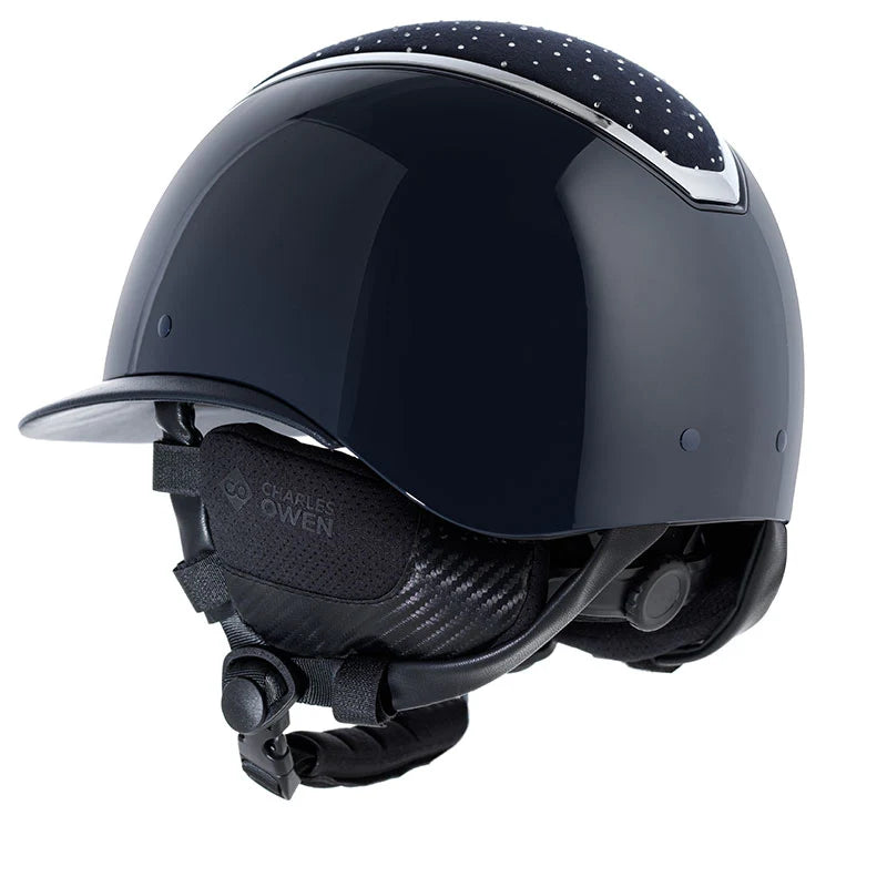 Finished with sleek Charles Owen branding and a modern black carbon look that pairs perfectly with any helmet.