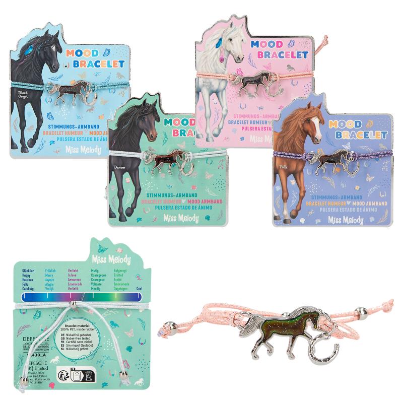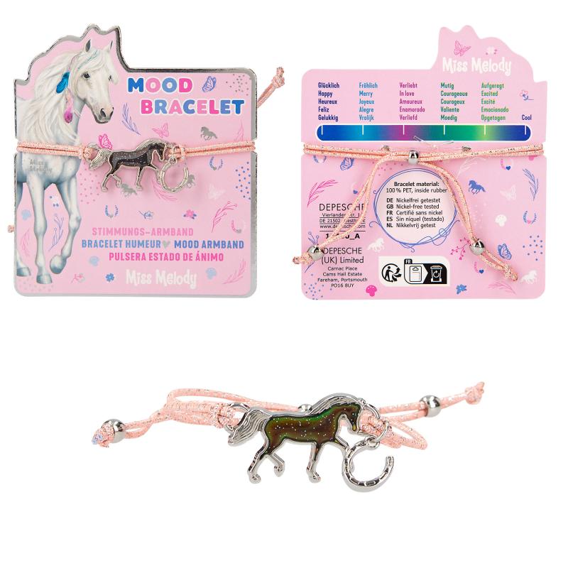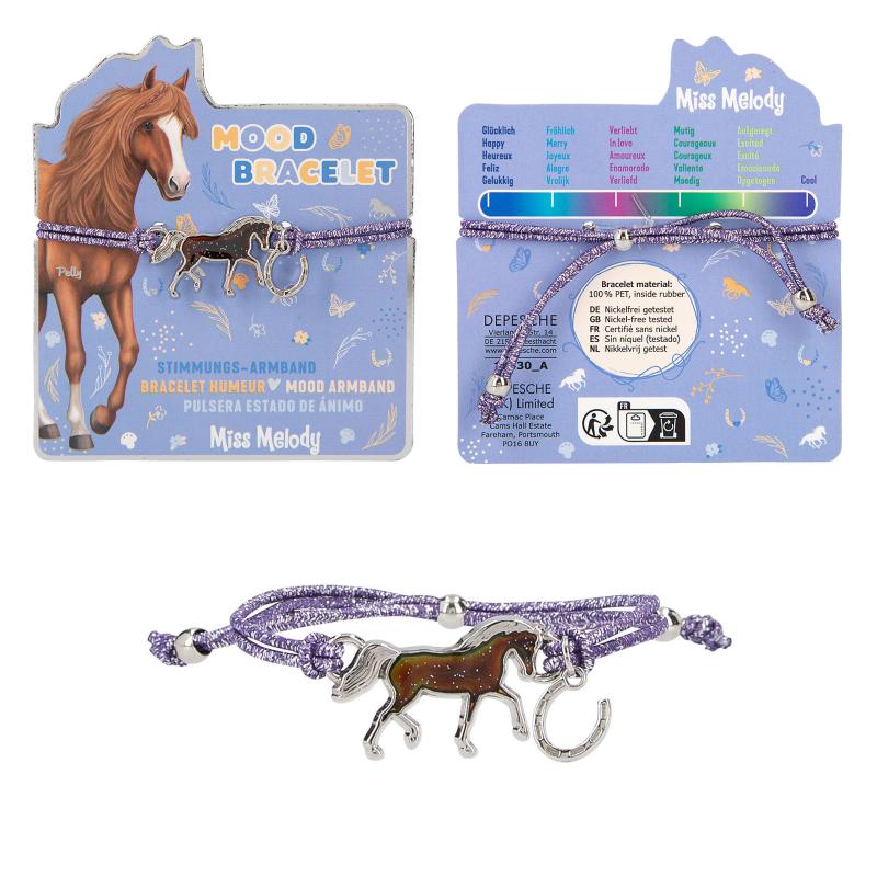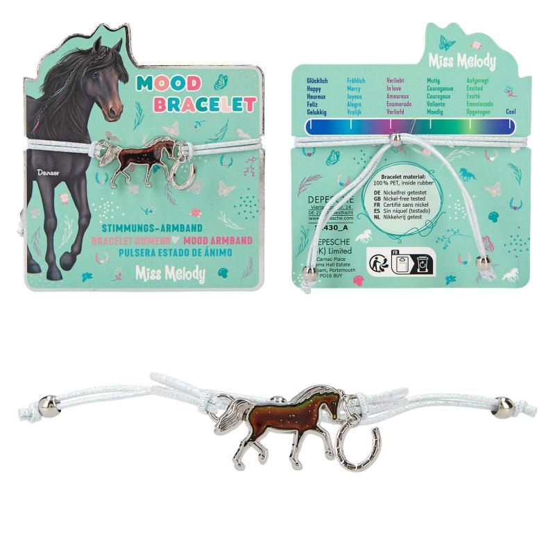 How is your mood? The Miss Melody bracelet reveals it with its horse- shaped mood barometer (temperature-dependent colour change). Another small horseshoe pendant hangs from the elastic, colourful glittering, easily adjustable bracelet. 4 different bracelet designs available. Nickel-free tested.