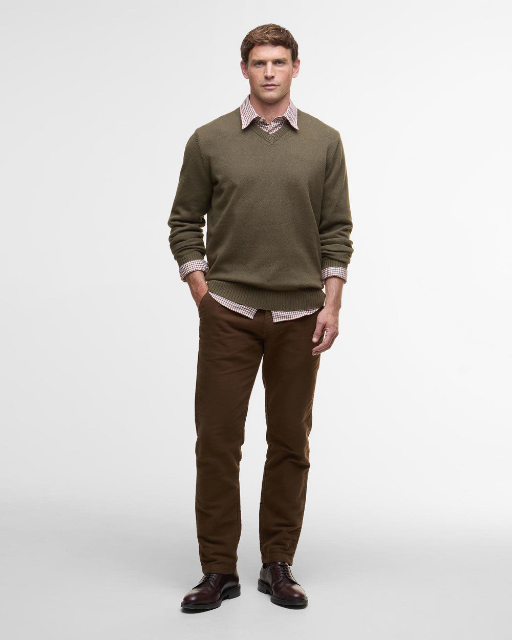 The men's Barbour Kelson V-Neck Knitted Jumper offers a perfect balance of classic design and modern comfort. Made from a soft wool blend, this jumper features a sharp V-neck with a contrasting inner neck for a subtle pop of style. The intricate rib detailing around the neck adds texture and refinement, making it a versatile piece for both casual and smart-casual looks. Ideal for layering or wearing solo, this jumper is a sophisticated addition to your colder-weather wardrobe.