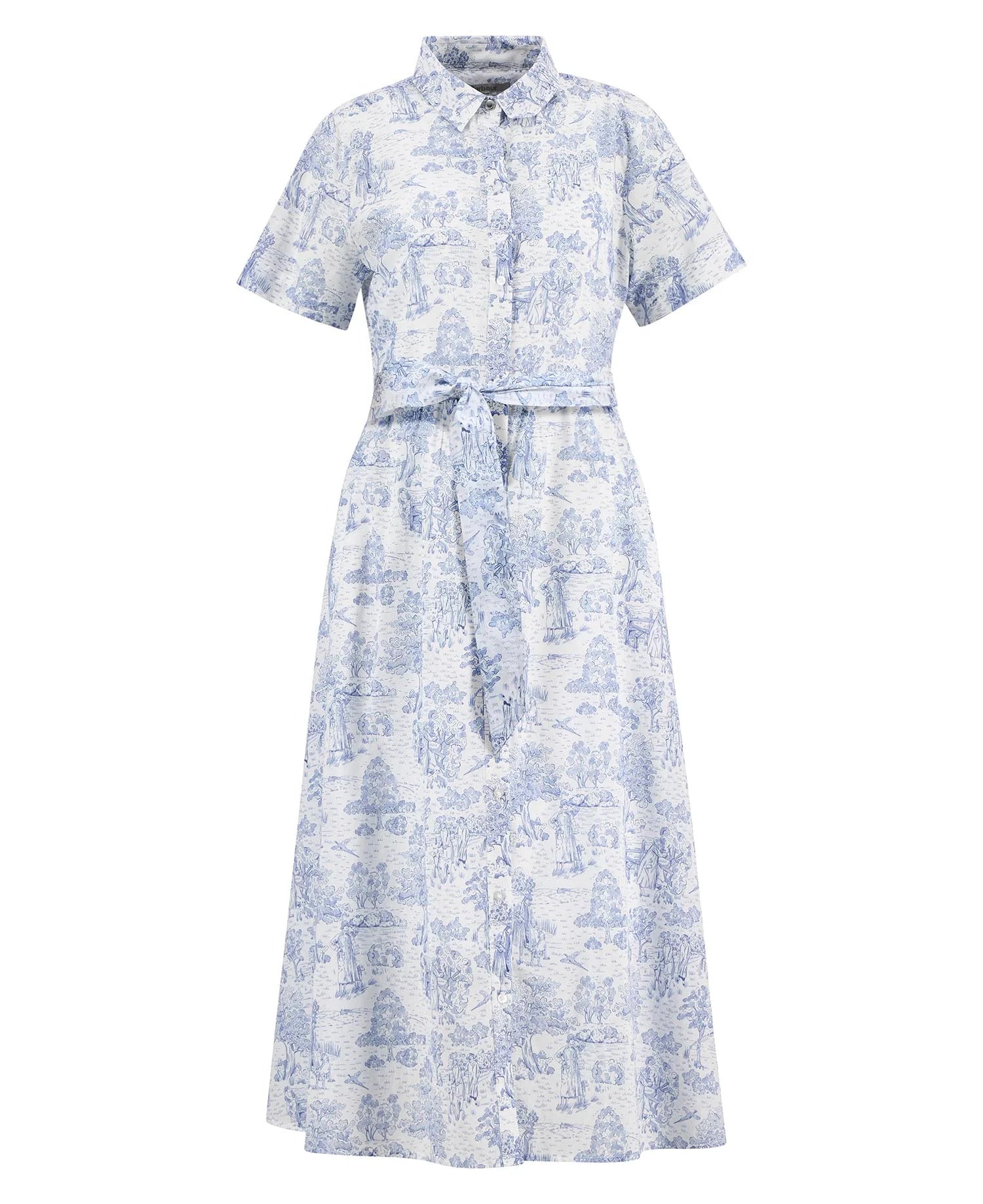 The Barbour Wisteria Midi Dress is a relaxed-fit style crafted from 100% lightweight cotton in a delicate toile de jour print. Featuring a branded brass shank button at the top neck, branded imitation mother-of-pearl buttons along the front placket and cuffs, and an ID bar at the back neck, it offers timeless Barbour detailing in a feminine silhouette.