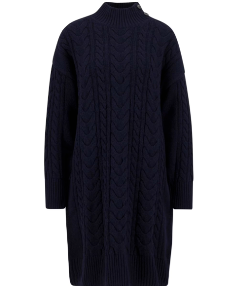 This dress features a comfortable funnel neck and a relaxed silhouette with dropped shoulders. The design is finished with ribbed trims and a decorative, non-functional placket adorned with mock horn buttons at the side of the neck.