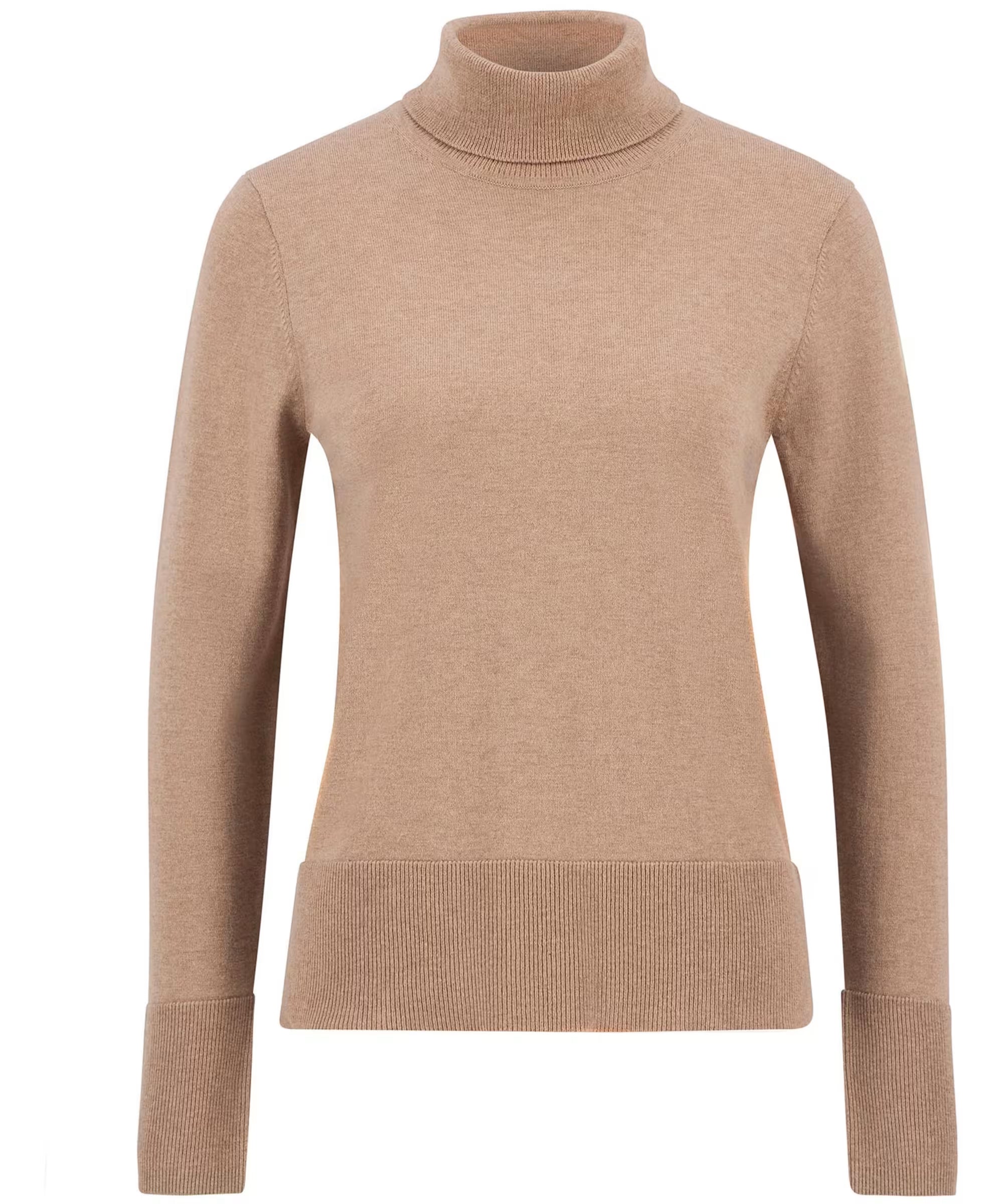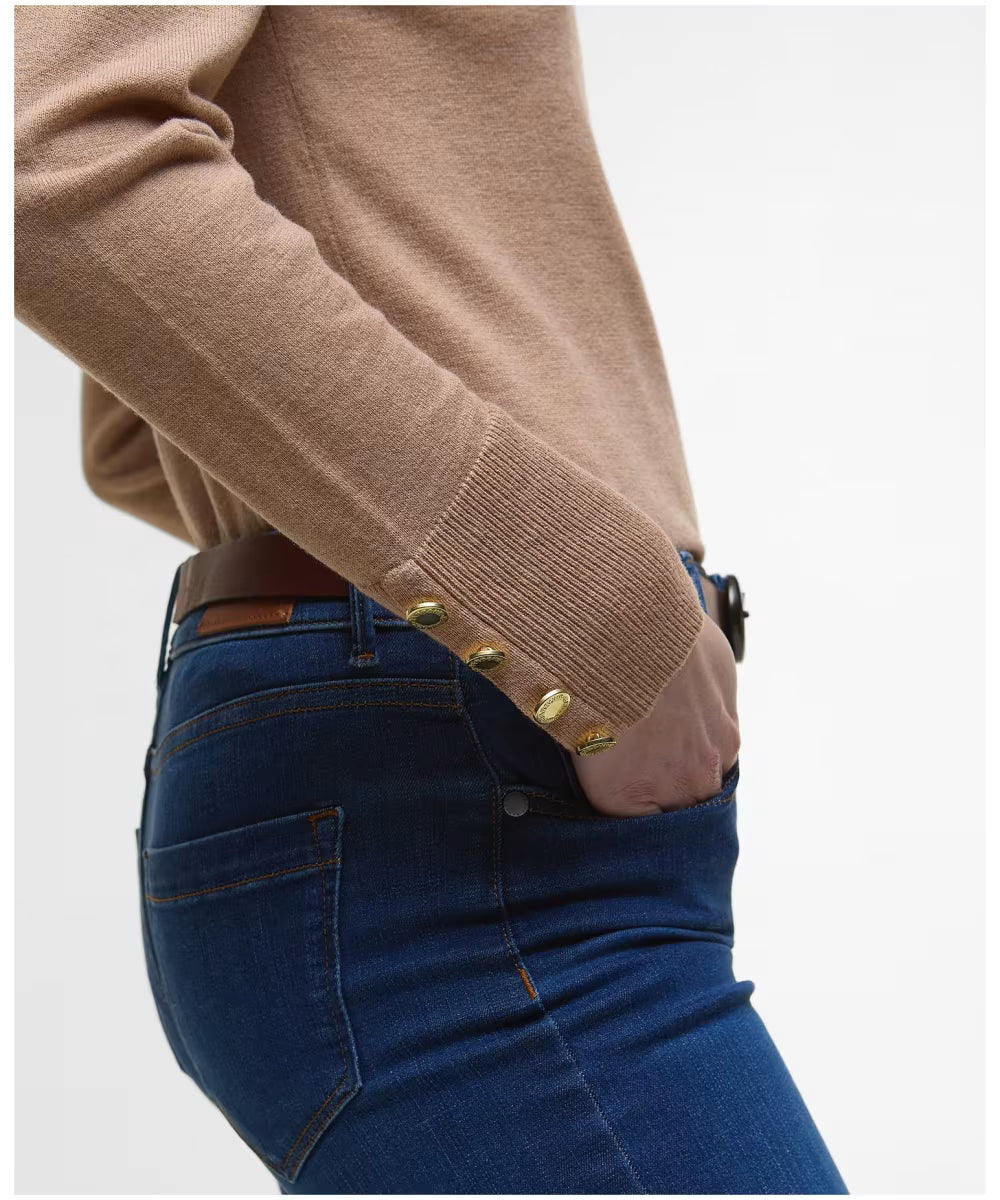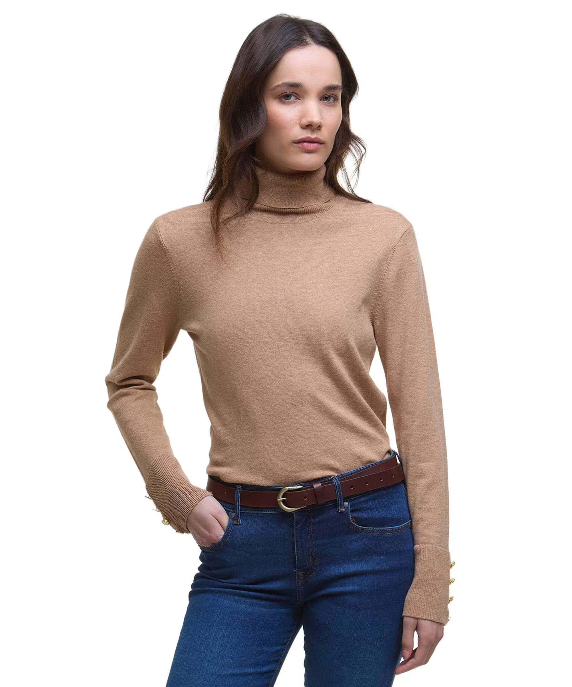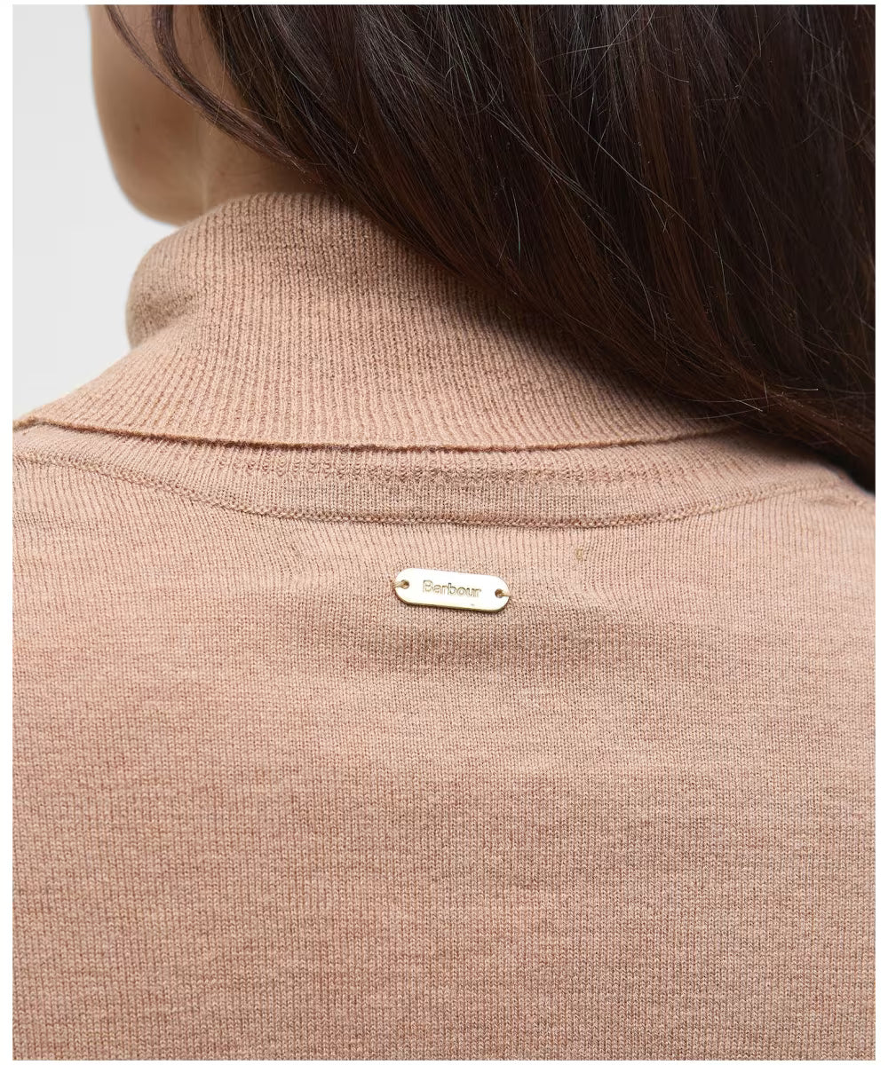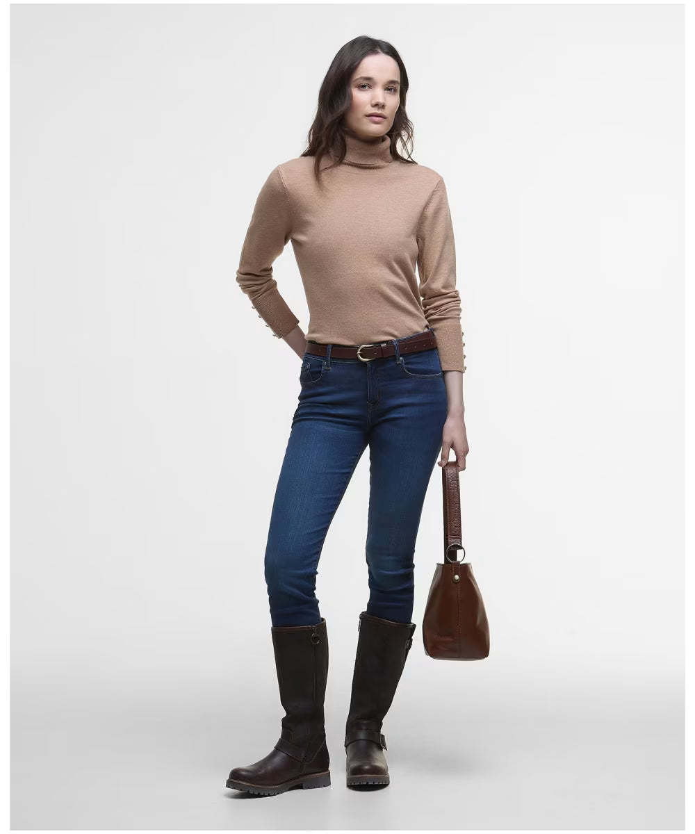 The women's Barbour Corbridge Knitted Jumper is a sophisticated roll neck sweater crafted in a fine gauge plain knit. This long-sleeved design offers a sleek and warm layer for cooler days. The elegant roll neck provides extra cosiness around the neckline keeping you warm and snug, while ribbed trims finish the cuffs and hem neatly. A slim metal Barbour ID bar subtly graces the back neck adding a nod to the quality of the piece. This refined jumper is perfect for smart-casual ensembles or layering under your favourite jacket for added warmth on colder days.