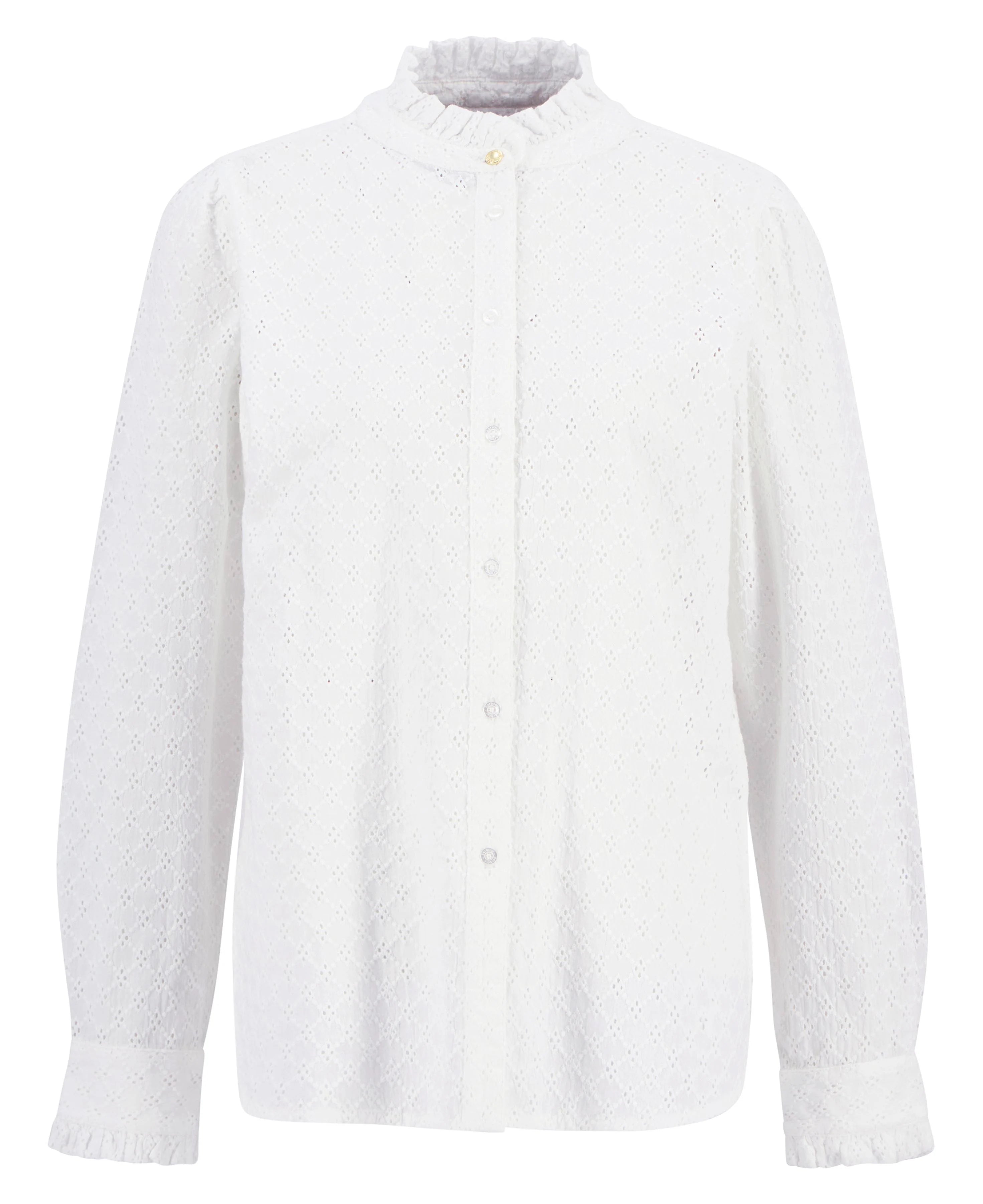 The Barbour Cynthia Long-Sleeved Shirt is a relaxed-fit style crafted from 100% cotton broderie. Featuring ruffle detailing at the neck and cuffs, a branded brass shank button at the top neck, branded buttons along the front placket and cuffs, and an ID bar at the back neck, it blends delicate feminine detailing with relaxed comfort.