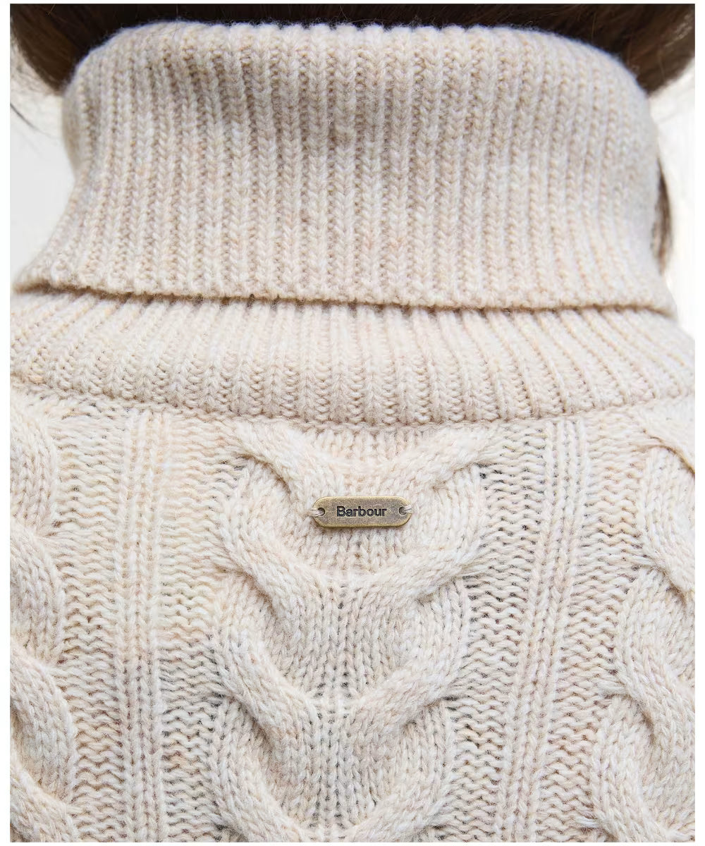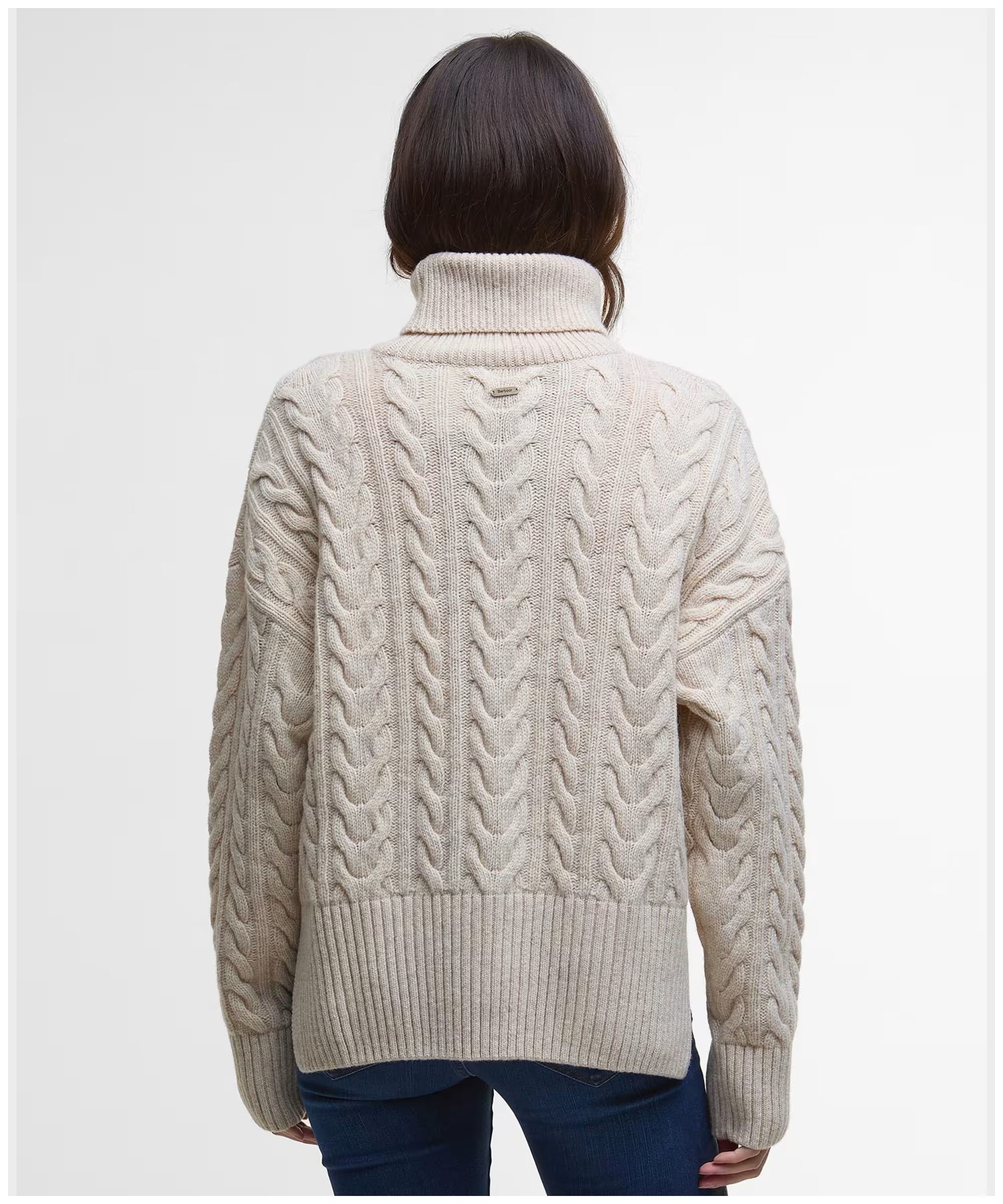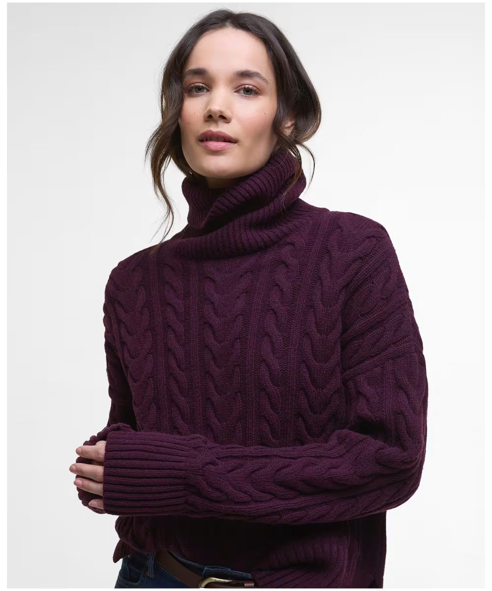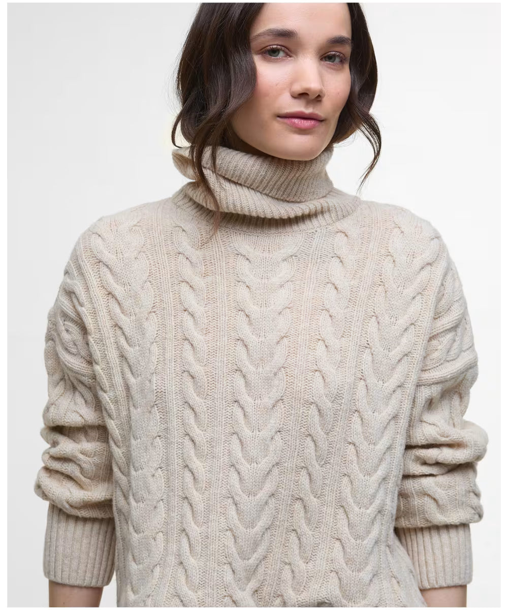 Introducing the women's Barbour Embleton Knitted Jumper, a cosy roll neck sweater featuring a traditional, all-over cable knit design.