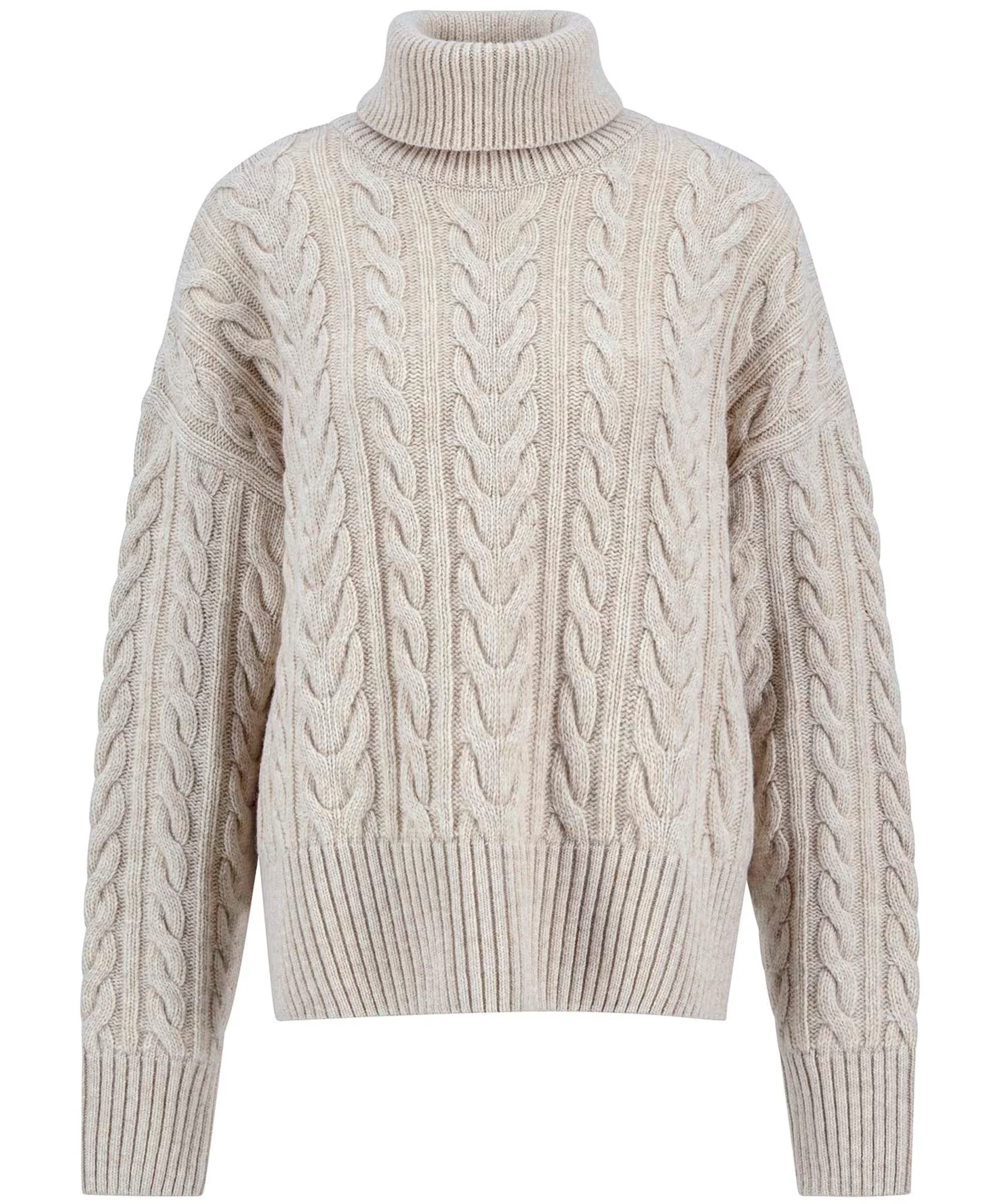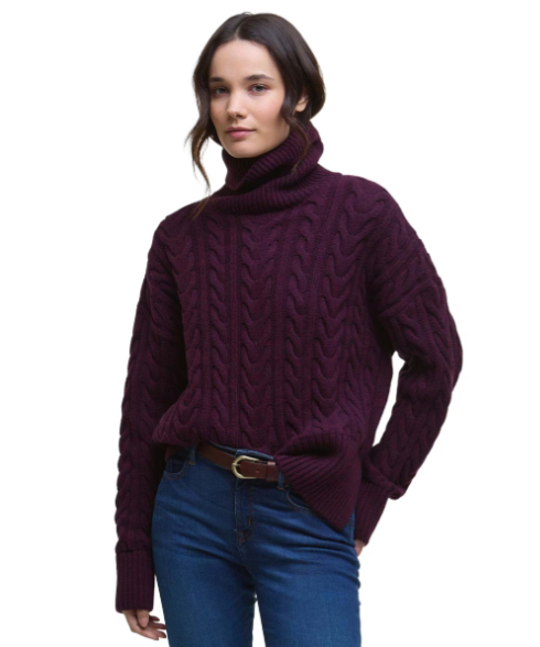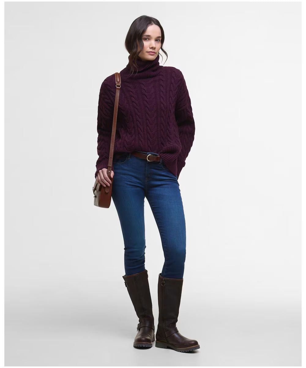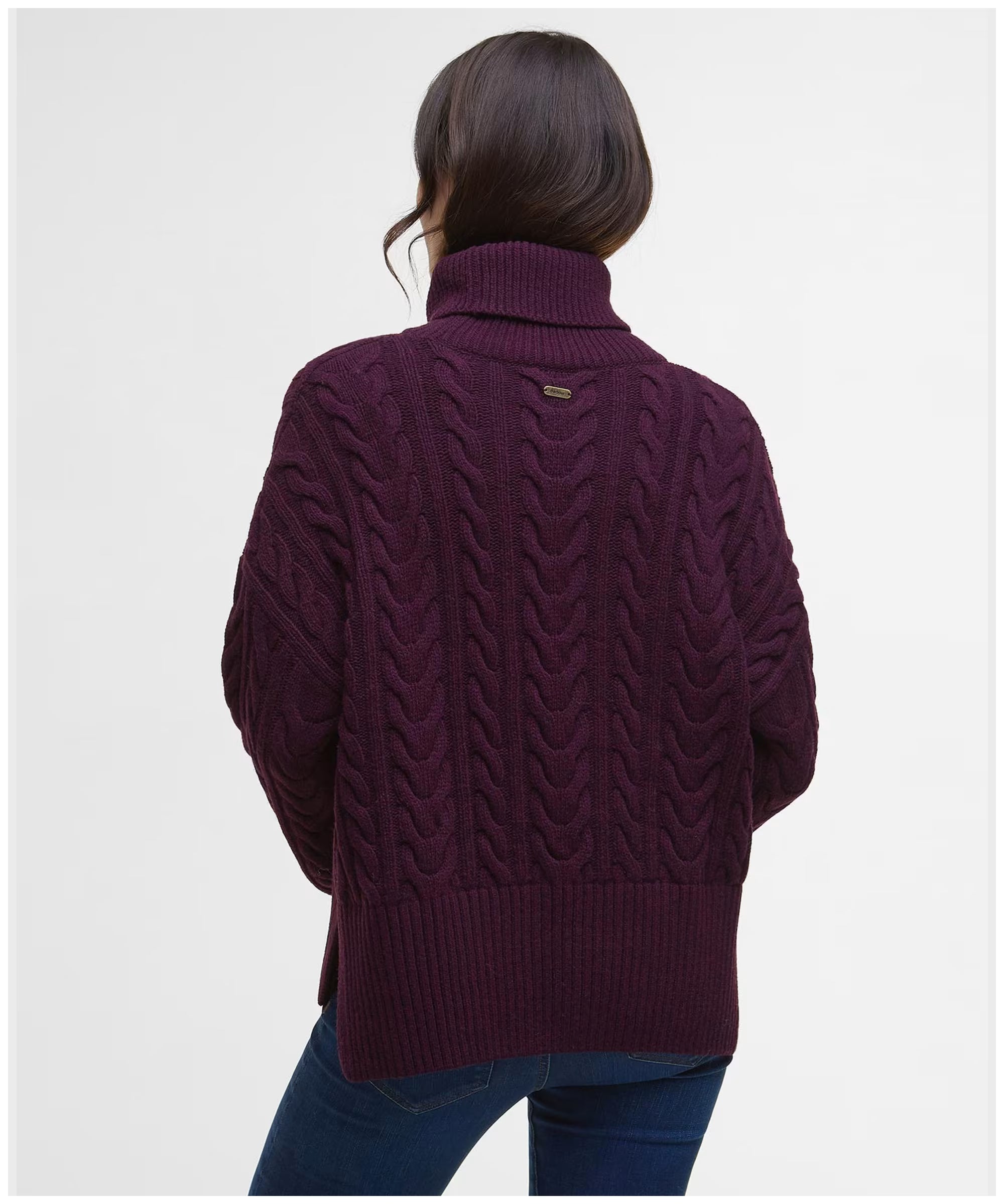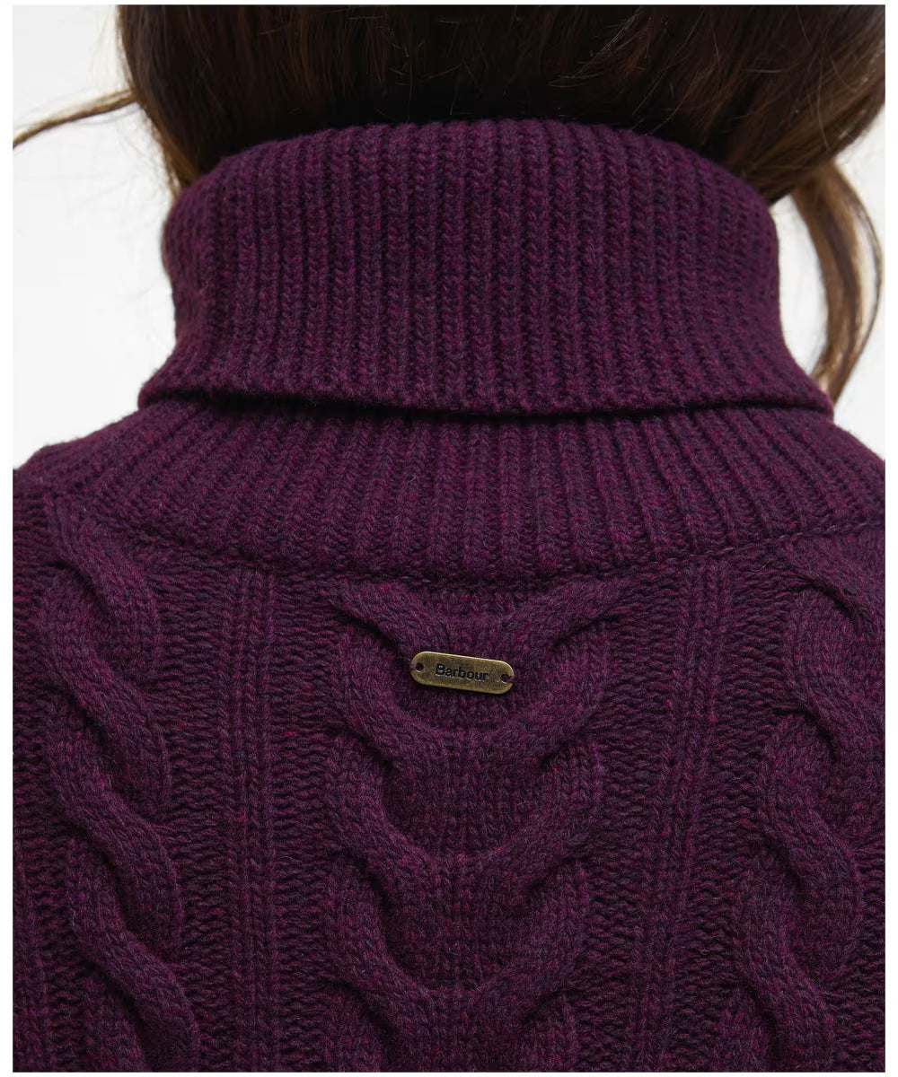 Introducing the women's Barbour Embleton Knitted Jumper, a cosy roll neck sweater featuring a traditional, all-over cable knit design.