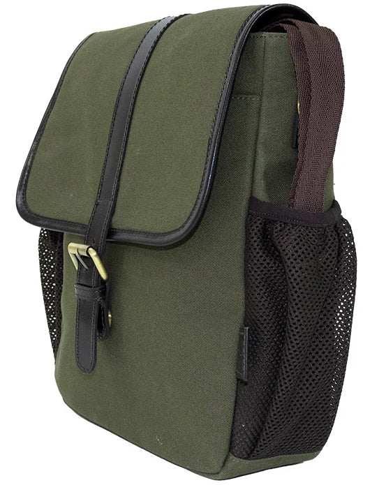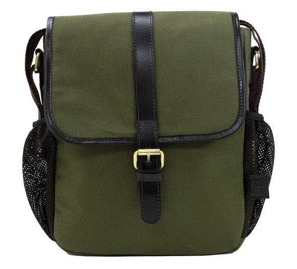 Leather trim and brass fittings, durable shoulder strap and two elastic pockets on the outside.