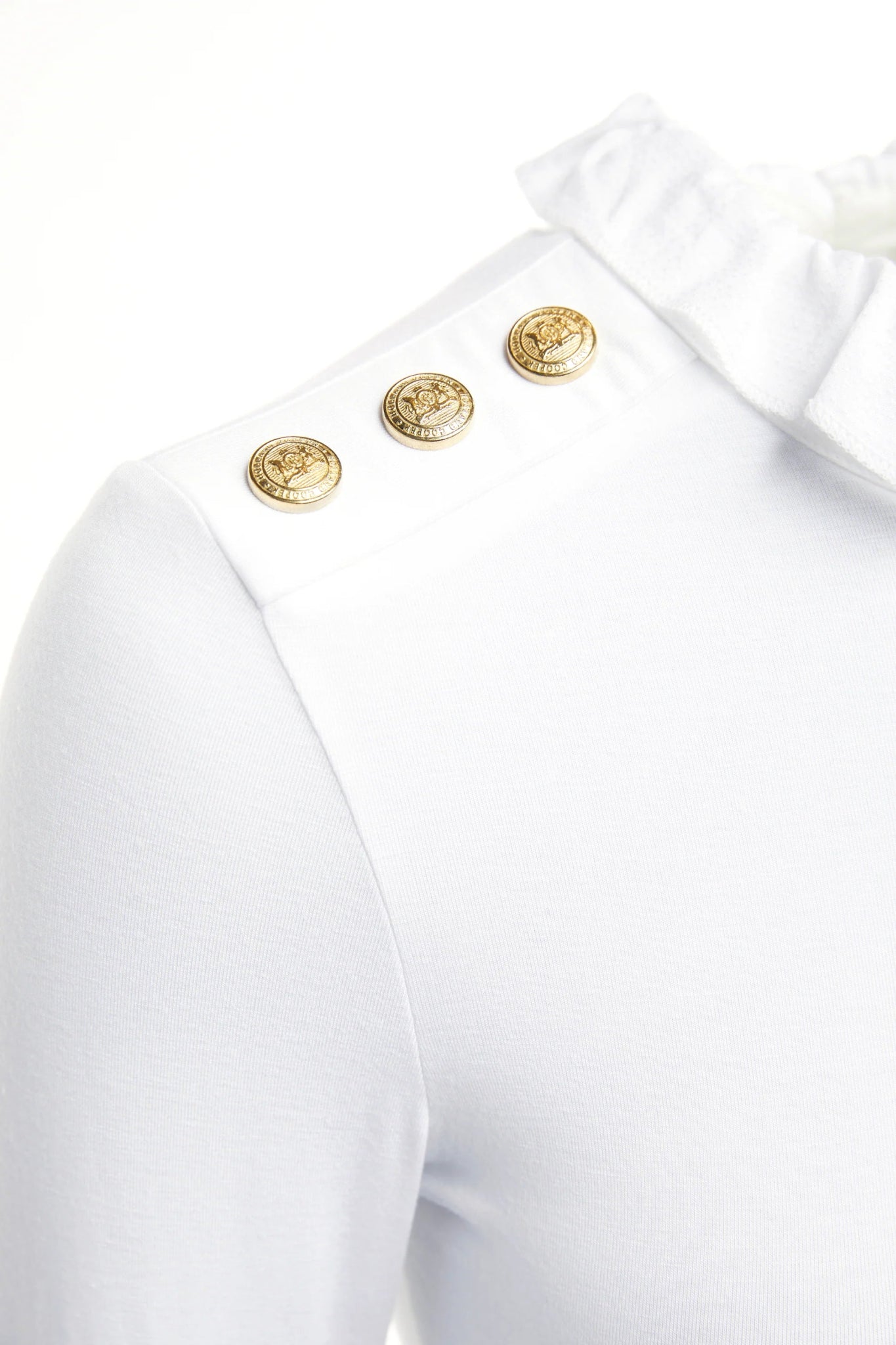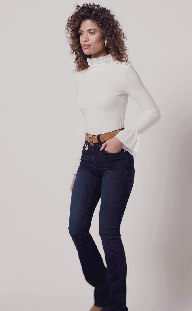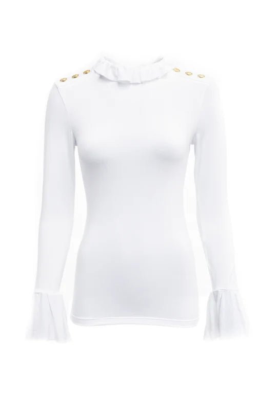 Created from a flawless and smooth fabric for a second-skin feel, this tee has been designed to become an everyday essential in your wardrobe. Designed with a body-contouring fit with a pretty ruffle neckline and cuffs, this piece is both flattering and elegant. Detailed with HC rivets on the shoulders.