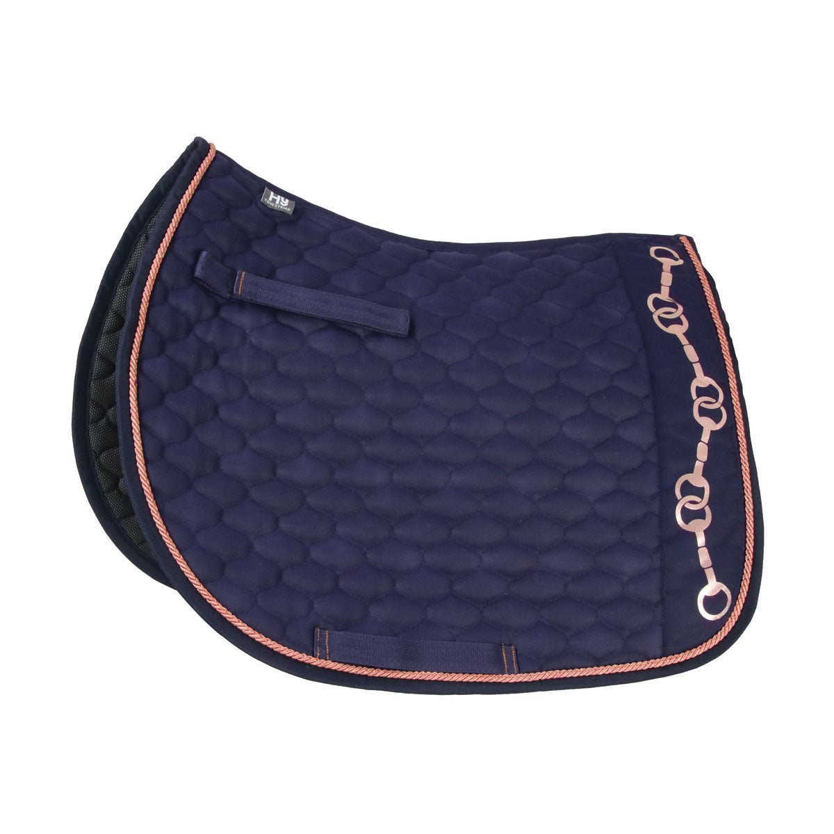 Smart and sophisticated, this navy saddle pad features rose gold braiding and intricate bit design. This classic shaped general purpose pad incorporates a raised wither to ensure a perfect and comfortable fit for your horse, complete with girth loops for a security. Why not co-ordinate with the matching fly veil and rider wear for the ultimate matchy matchy look?