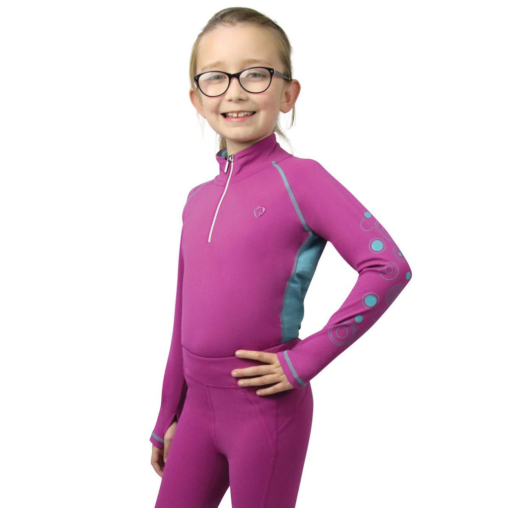 This is the perfect base layer for training or galloping round a cross country course, ideal for the active equestrian! With a snazzy, silicone ecliptic circle pattern on the arms in contrasting colours and matching flatlock stitching. This close fit base layer is made from soft, stretchable fabric and features a ¾ zip. Matching items available.