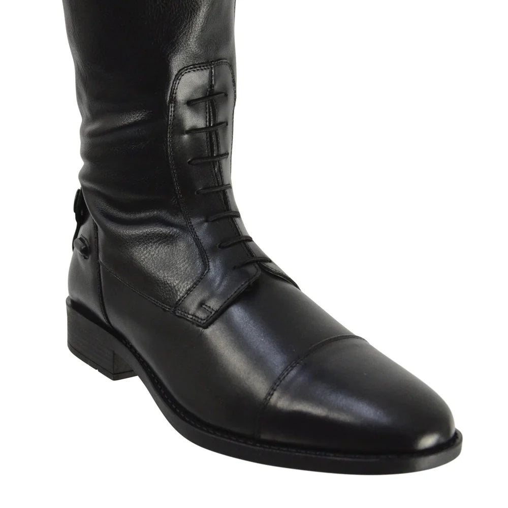 This elegant long boot is perfect for the competitive or everyday rider. Fitted with lace fronts for the classic field boot look, this boot features a leather foot and inner calf, with a synthetic leather outer for a tailored fit. This boot sits close to your skin to allow precise, measured movement. The heel incorporates two rubber spur studs for optional use, and the boot is finished with a press button spur guard to the bottom of the boot. Fully lined for added comfort and sitting on an anti-skid sole, this secure, well-fitting boot is an excellent choice for competing or schooling.