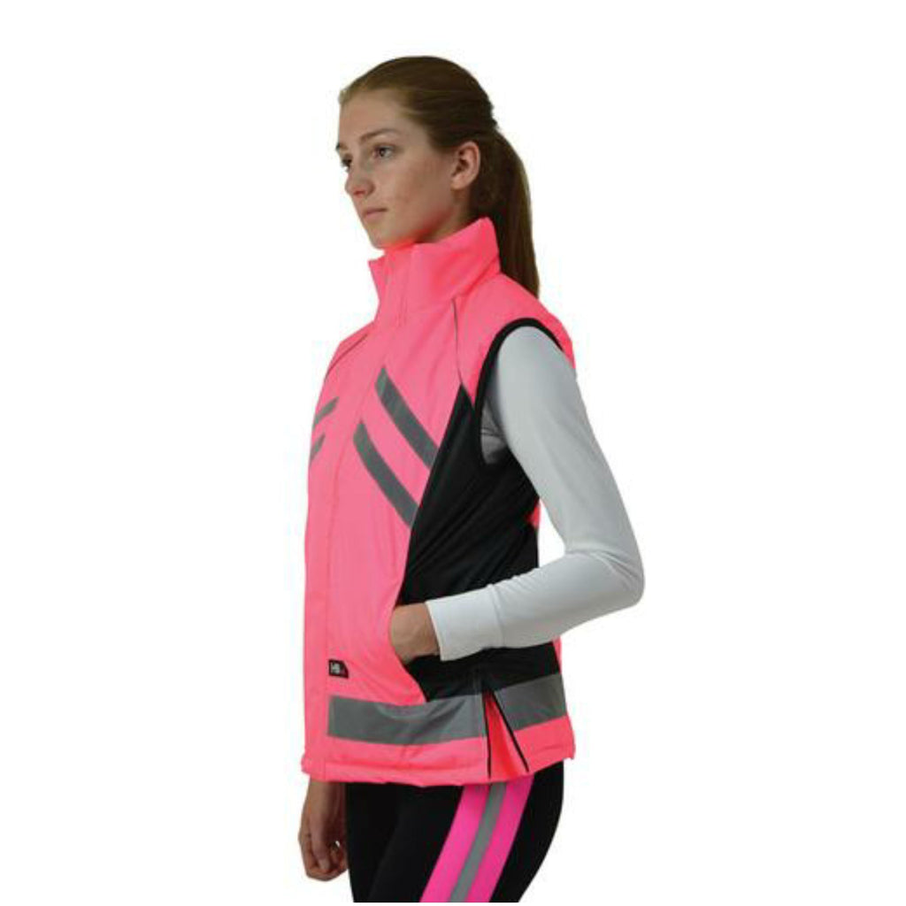 Be safe, seen and warm with this practical and flattering padded gilet. The fluorescent outer features reflective stripes for ultimate visibility on dark and dull evenings. Dark panels beneath the arms create a flattering appearance! Zipped panels create a flexible fit for when you're in and out of the saddle, whilst the pockets provide a secure place to secure your possessions.