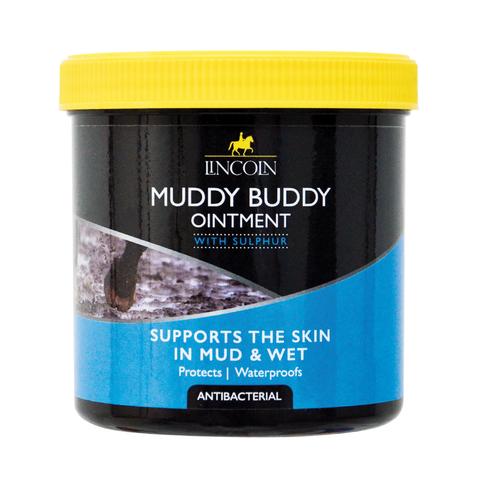 Waterproof barrier for horse's legs and heels This Muddy Buddy ointment from Lincoln works in three different ways to help combat the problems which can arise from exposure to wet, muddy conditions. It will soothe any existing sores and inflammation, whilst at the same time combating harmful bacteria and providing a protective waterproof barrier. For application to the horse's heels and lower legs. Features Powerful antibacterial ointment Provides a waterproof barrier to protect skin from wet environments Soothing properties 500g. We Say An excellent ointment which covers all bases when dealing with mud fever and other skin irritations related to wet, muddy surroundings. Suggested uses Before turnout or exercise when it's wet underfoot. 500g.