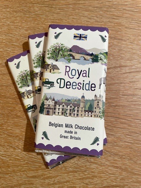 Our Scotland 'Royal Deeside' Chocolate bar comes in a beautifully illustrated sleeve with many Scottish landmarks, sayings and traditions, from Balmoral Castle to Roaring Stags, there's something to make every Royal Deeside fan smile!