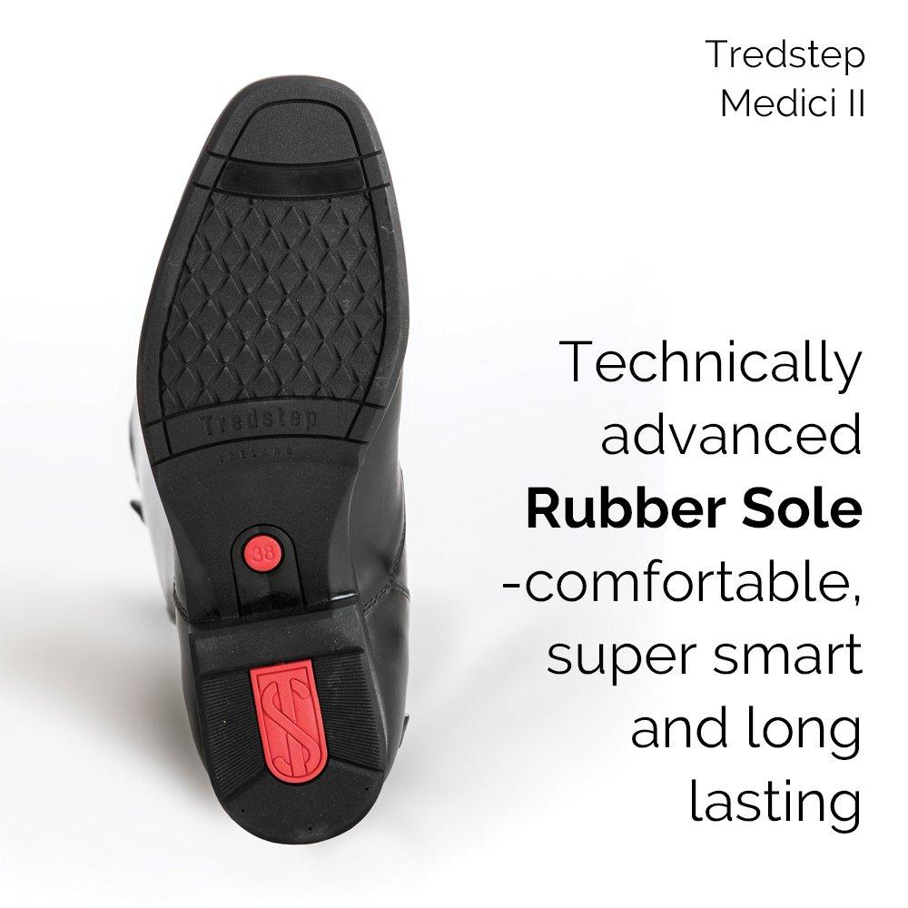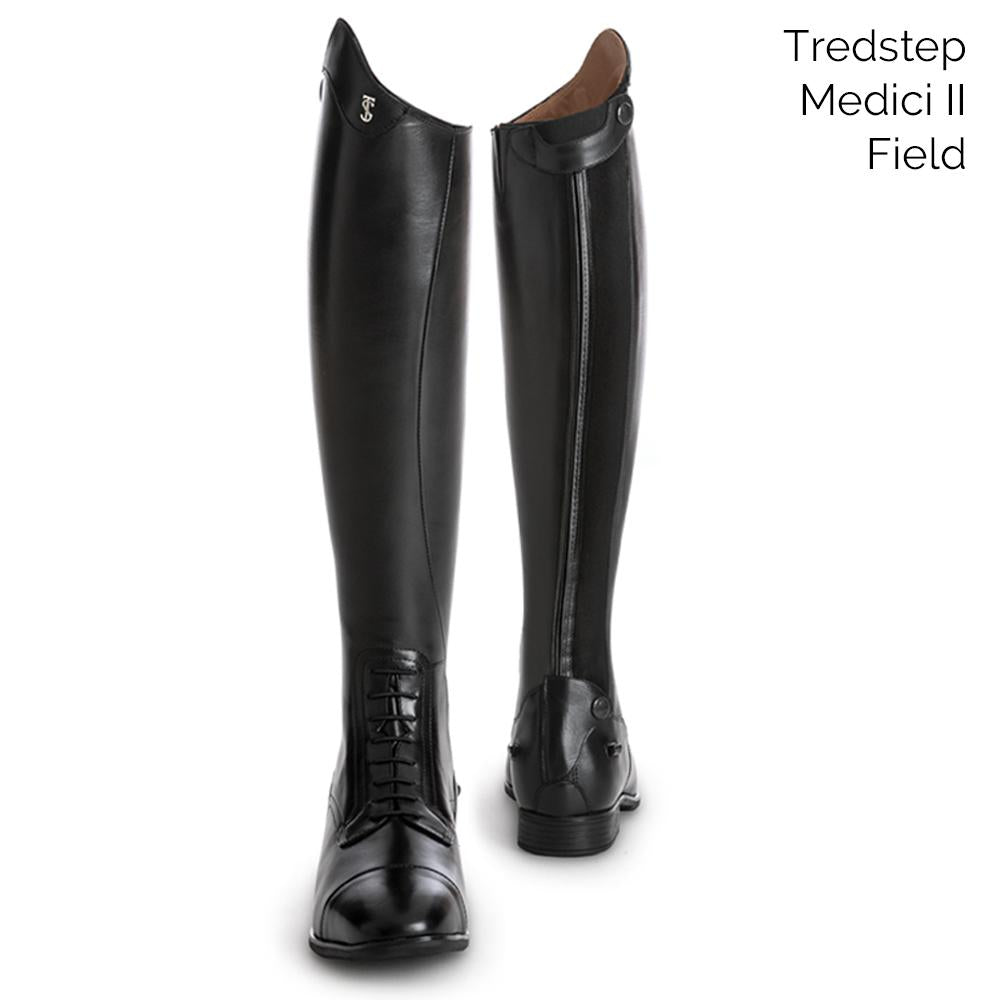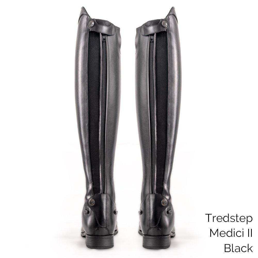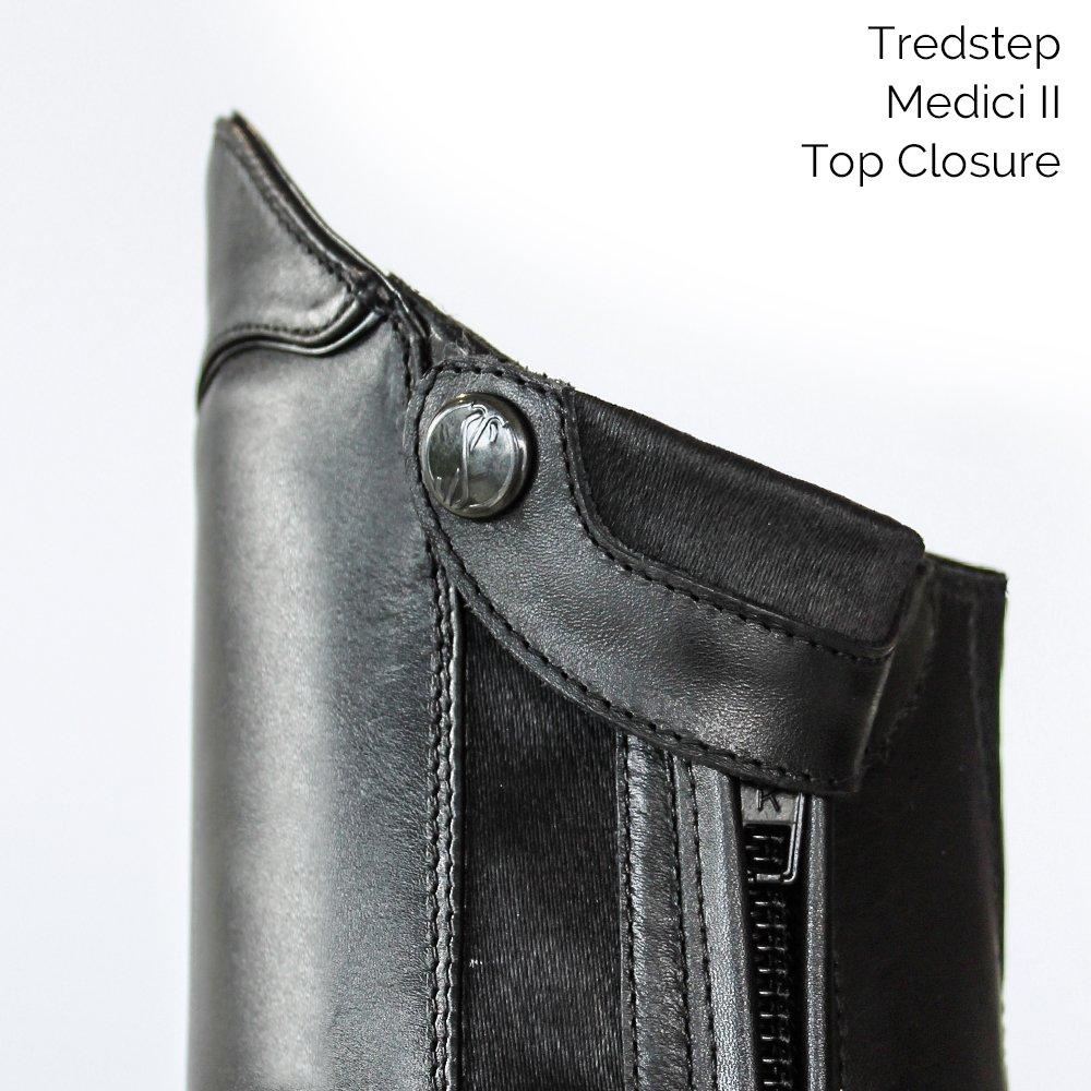 • High tensile stretch panel Meticulous European craftsmanship and sumptuous hand sourced calfskin leathers envelope and enhance the natural shaping of the rider’s leg, The Medici II combination of anatomical shaping with a new high tensile stretch panel and heavy-duty rear zip ensures a really secure contoured fit. The introduction of a new cushioned elastic easy closure at the top of the boot provides more comfort behind the knee. Mounted on an evolutionary cushioned rubber sole which combines a classic profile with the latest in sole technology, this coupled with a coolmax lined cushioned footbed ensures advanced stirrup grip and ankle flexibility while reducing foot fatigue. Additional features