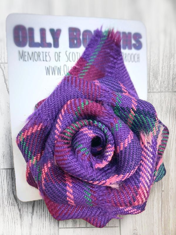 A hand-crafted rose brooch designed from Memories of Scotland tartan. Let the tartan transport you to fresh Highland landscapes in the Scottish summertime. The colour palette of our tartan was inspired by sweet smelling fields of heather, rolling green hills and forests and the pinks from hazy summer nights sky. Each product in this range comes with a card describing the tartan.