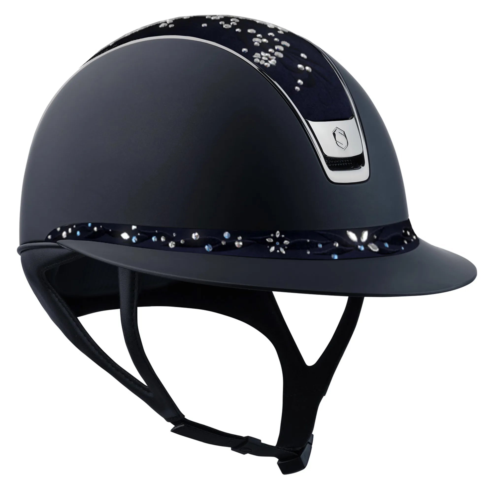 Exquisite materials - polycarbonate, a material found in top-tier motorgear - coupled with an anti-scratch paint give the Shadow Helmet unparalleled form and function. Embedded around the helmet's contours, up to 300 Swarovski crystals provide a glimmering accent to the signature edging. Advanced ventilation optimizes airflow with this helmet's 6-point system. Ergonomically designed, the integrated chinstrap offers the perfect fit for all hairdos, including a trainer's bun. Memory foam ensures a consistent thickness over time, while a semi-rigid chinstrap prevents hazardous tipping. Inside, variable-density polystyrene diffuses energy from impacts, accompanied by a removable comfort foam secured via a reliable clip system. Finally, the foam can be washed at 30°C for a permanently clean and pleasant aroma.