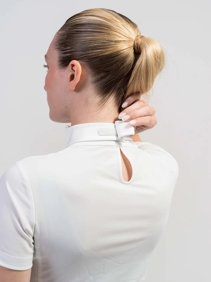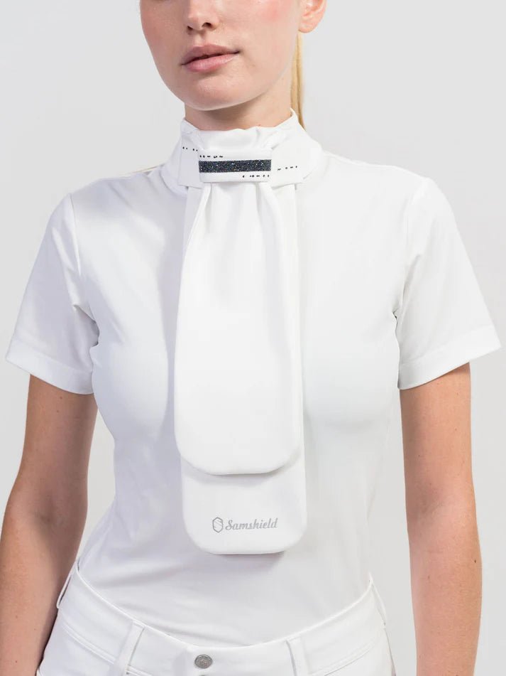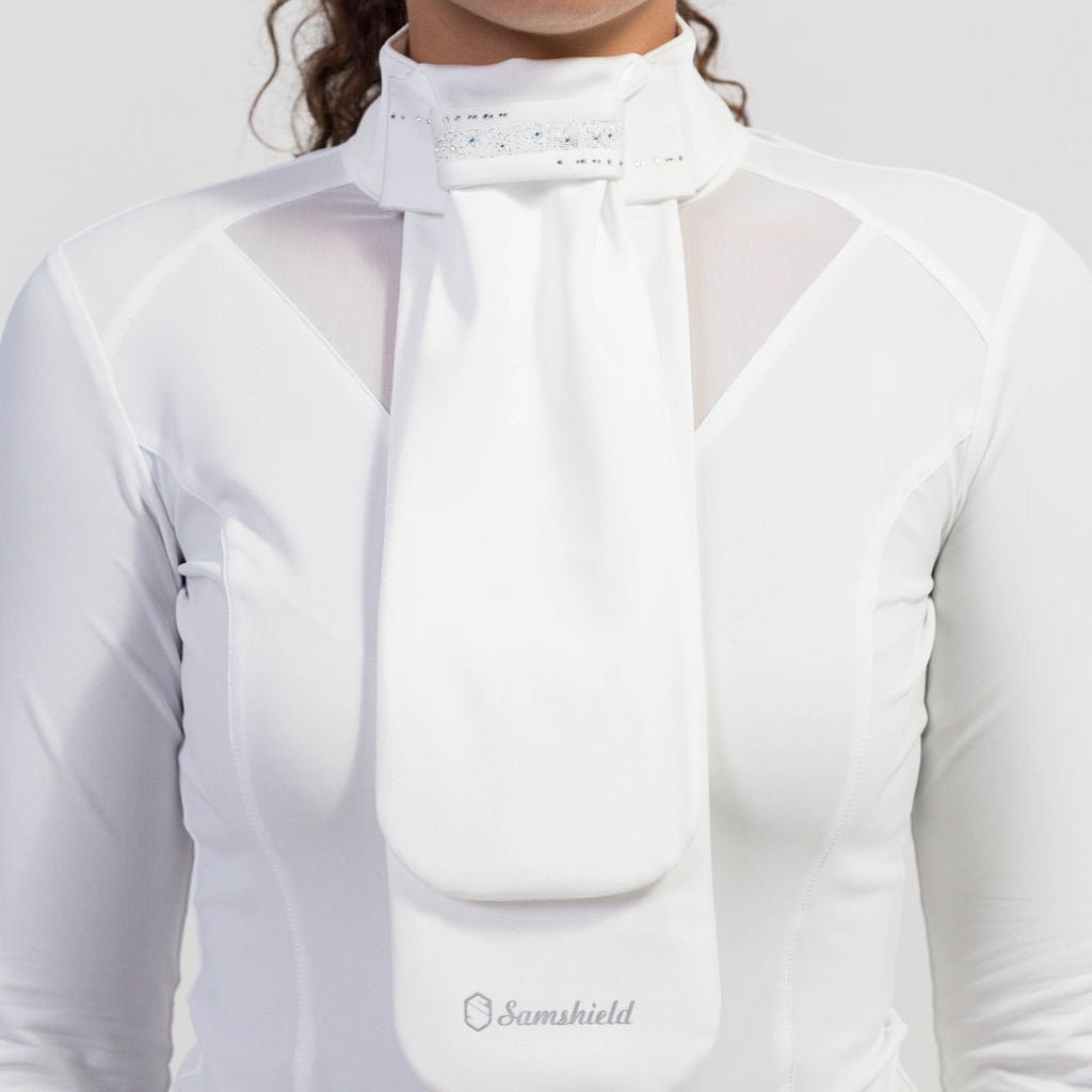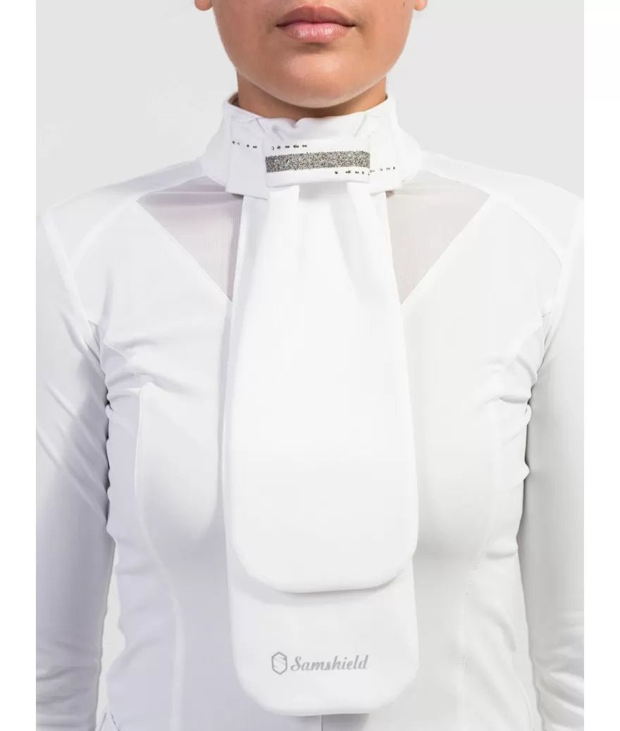 The Plastron Crystal Fabric Ready Tied Stock offers a stunning finish to compliment any competition outfit. A band of Swarovski Crystal Fabric highlights the top, whilst the Samshield print logo sitds across the bottom. Velcro fastening at the reverse aids easy use for the wearer. Machine washable at 30'