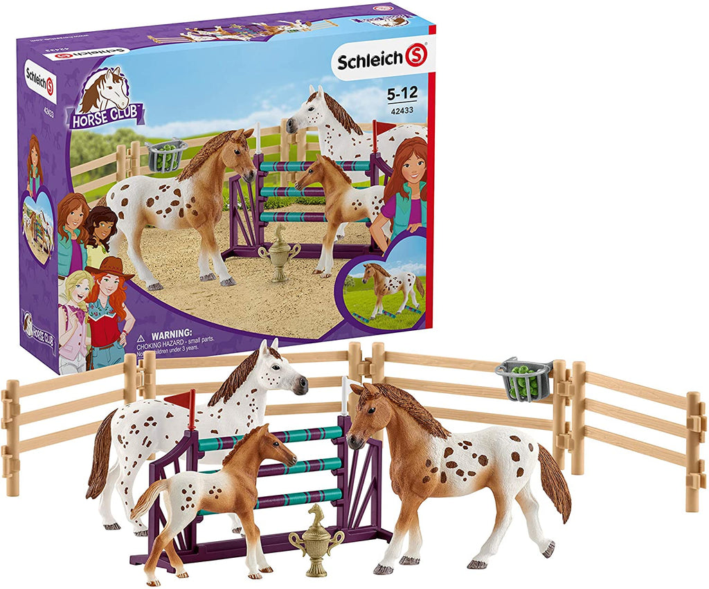 Lisa is training the Appaloosas for the upcoming horse show. When Lisa came by the Appaloosas’ paddock one day, she saw the mare jumping over obstacles – even though the Kramers were actually intending to train her for western riding. Since then, Lisa has been training with the mare in secret. The small, speckled foal and the gelding watch curiously from the paddock.