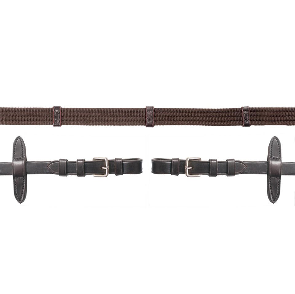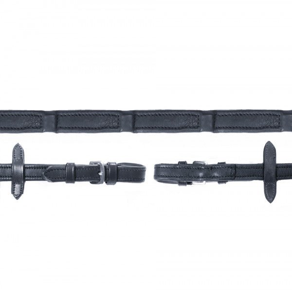 Classic WEB REINS with hook and stud closure, made out of a 19 mm wide web material with leather bars. The reins are equipped with rein stops for a safe use of a martingale.