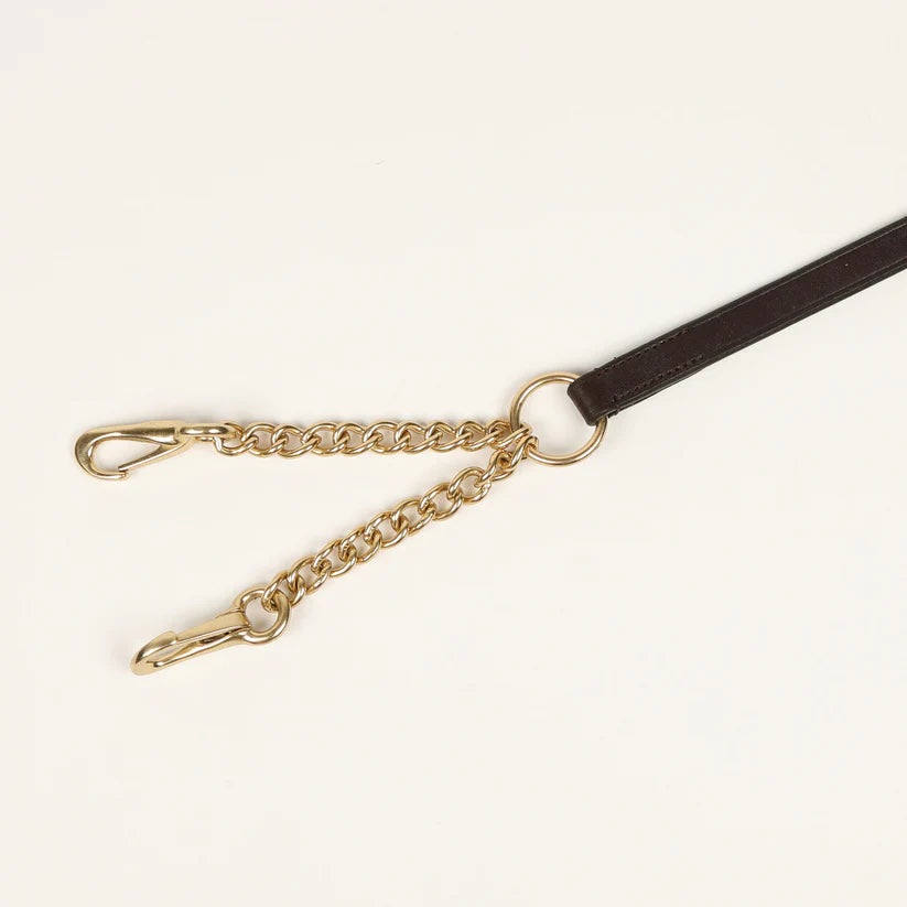 Velociti GARA leather lead rein with small Newmarket chain. 79" (2m) long, 5/8" (16mm) wide. Durable leather is eco-friendly vegetable tanned, hand-stitched with self-colour thread. Restrained design gives Velociti GARA leatherwork enduring appeal.